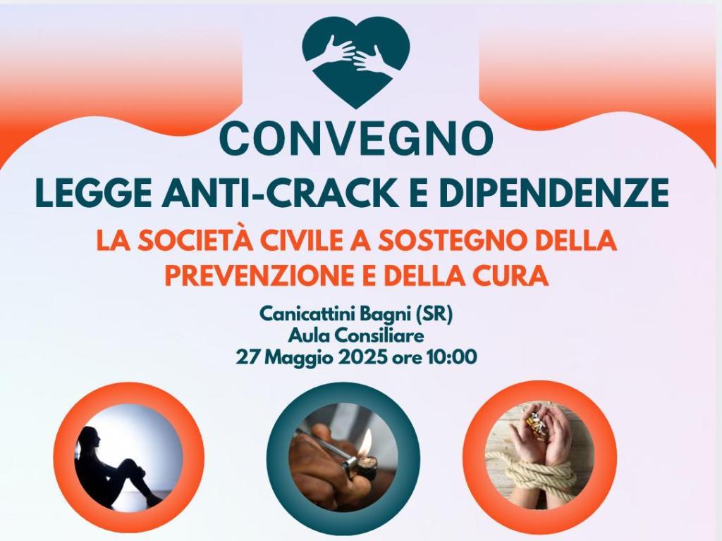 A porre l’attenzione sul tema è il Comune di Canicattini Bagni con il Convegno, “Legge anti-crack e dipendenze – La Società Civile a sostegno della prevenzione e della cura”, promosso in collaborazione con la Commissione Provinciale Politiche Giovanili di ANCI Sicilia, l’UOC Dipendenze delle ASP di Siracusa e Catania, e l’Associazione Preoccuparci ODV, che si terrà martedì 27 maggio 2025, ore 10:00, presso l’Aula Consiliare del Comune in via Principessa Iolanda 51.