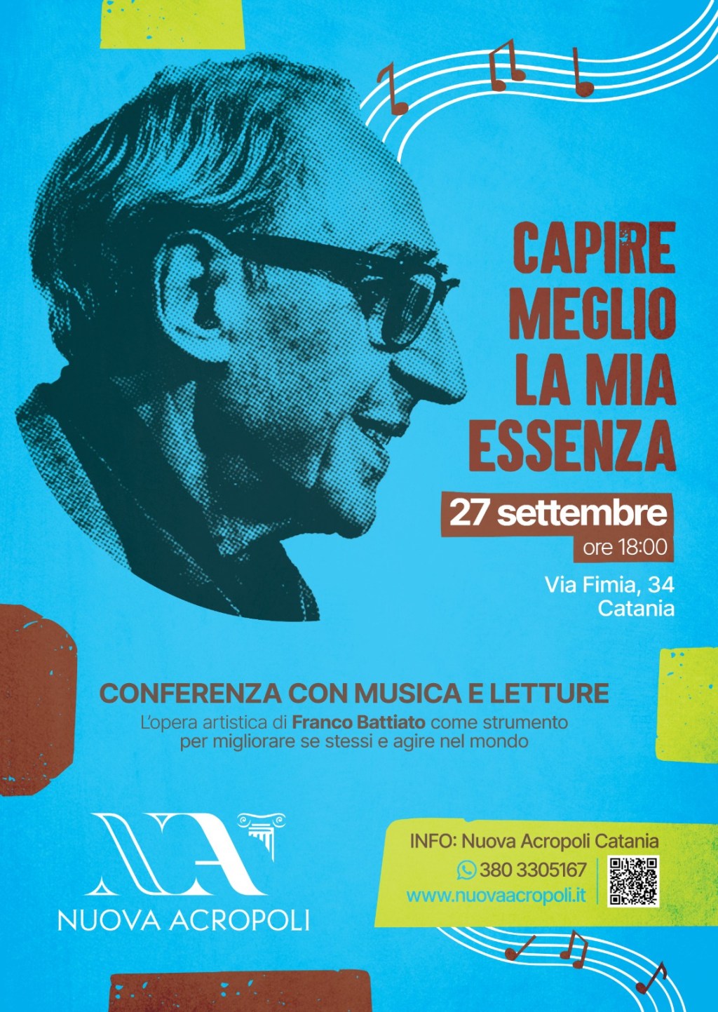 Nuova Acropoli Catania organizza, sabato 27 settembre alle ore 18:00 presso la sede associativa di via Fimia 34, un incontro culturale dedicato a Franco Battiato, artista che con la sua musica e le sue opere ha saputo parlare alla parte più profonda dell’essere umano.