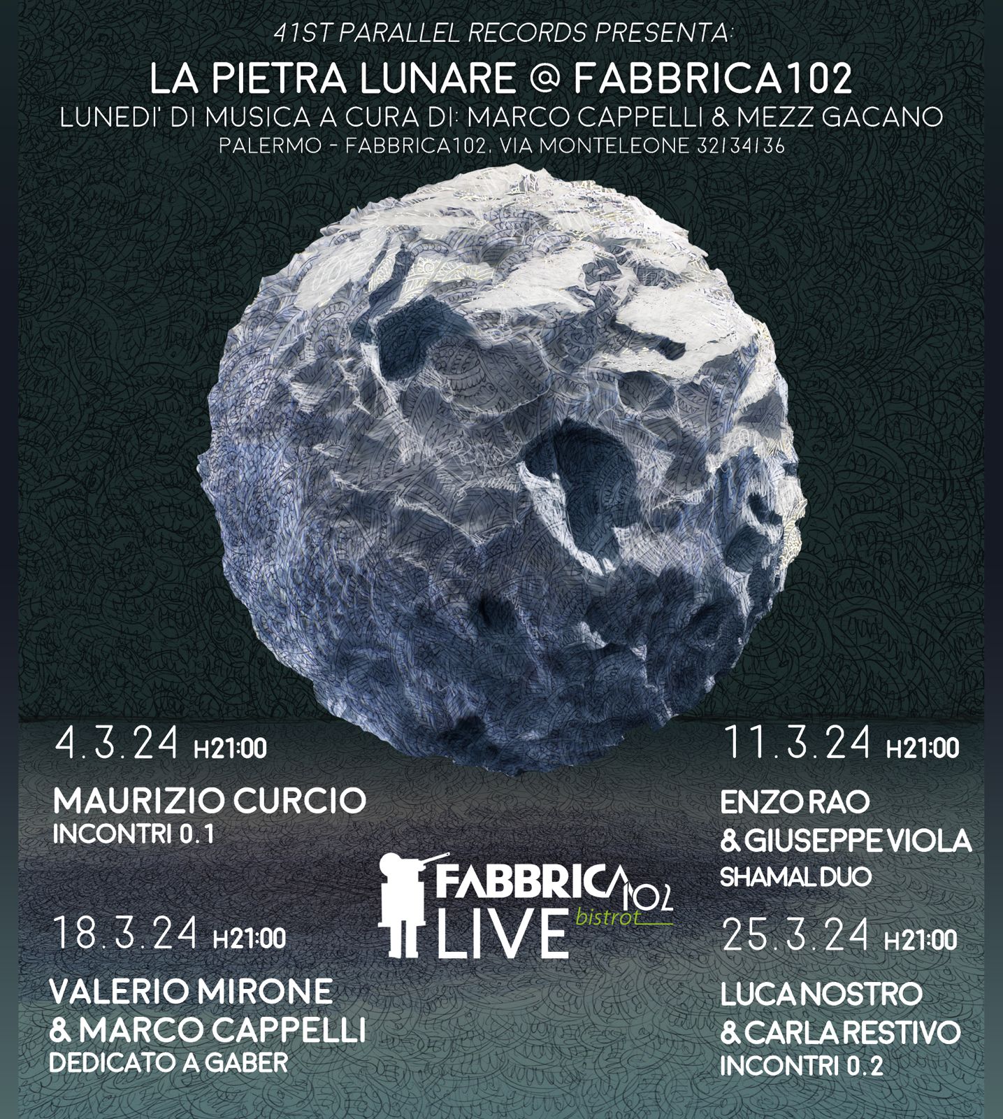 I due convinti sostenitori dell’ipotesi che Palermo sia ricchissima di “sostanza musicale”, spesso ignorata dai circuiti d’intrattenimento, decidono di dar vita, complice l’ospitalità di Fabbrica 102, a LA PIETRA LUNARE, rassegna unica nel suo genere, intergenerazionale ed eterogenea.