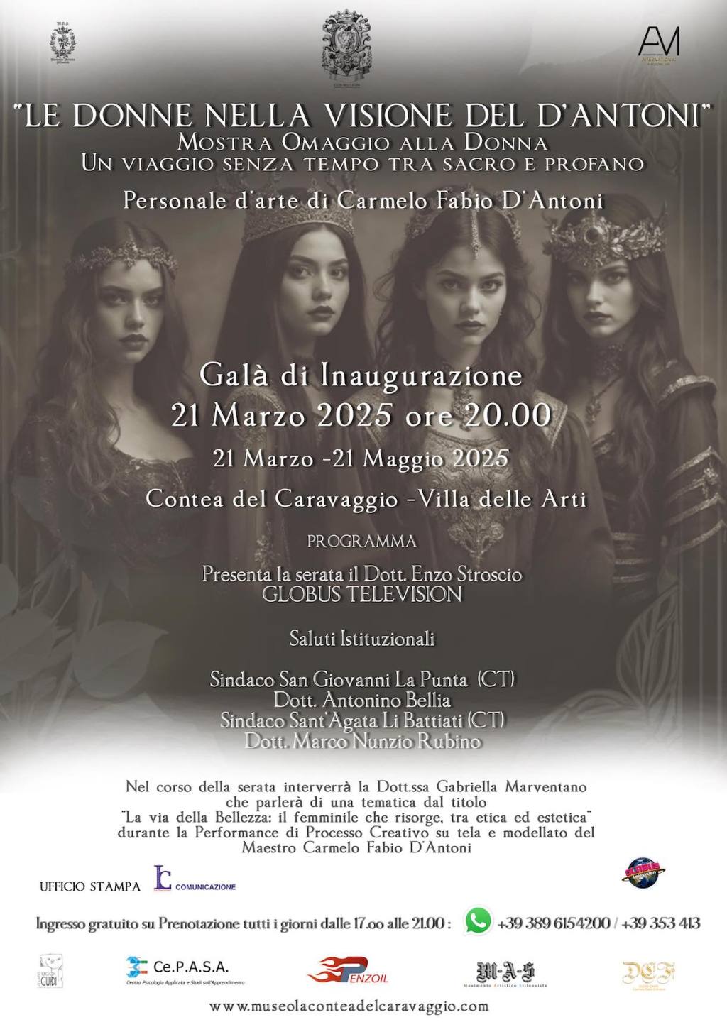 L’arte come un ponte tra passato e presente è un linguaggio senza tempo, capace di catturare l’essenza dell’essere umano e restituirla in forme di straordinaria bellezza. È proprio questo il concetto a cui si è ispirato l’Artista Carmelo Fabio D’Antoni per la sua personale dal titolo: “Le donne nella visione di Carmelo Fabio D’Antoni” – Mostra Omaggio alla Donna – Una visione senza tempo tra sacro e profano. L’esposizione, si terrà presso il prestigioso contesto della Villa delle Arti, Contea del Caravaggio, a cui è annesso lo studio dell’Artista, nonché sede del M.A.S. (Movimento Artistico Stilnovista) di cui al momento, il Maestro Carmelo Fabio D’Antoni è l’unico esponente. Il progetto verrà inaugurato venerdì 21 Marzo 2025 alle ore 20.00 e sarà visitabile ad ingresso gratuito, esclusivamente su prenotazione fino al 21 Maggio 2025. La mostra vuole essere un omaggio alla donna che secondo la visione dell’Artista è una figura da sempre presente nell’arte e nella cultura, eterna musa ispiratrice di grandi capolavori e simbolo di mistero, forza e delicatezza. Come avvenimento unico ed interessante, nel corso della serata, il Maestro D’Antoni darà vita a un’opera su tela e a una modellazione dal vivo, offrendo al pubblico un’esperienza artistica particolarmente coinvolgente.