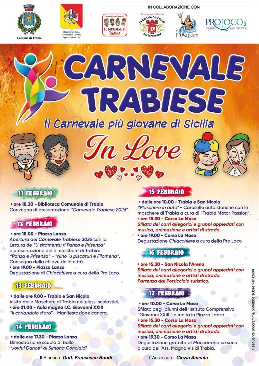 Il momento più atteso arriva domenica 15 febbraio con “Maschere in auto” tra Trabia e San Nicola l’Arena, seguito dalla prima grande sfilata dei carri in Corso La Masa e dalla degustazione gratuita delle chiacchiere.