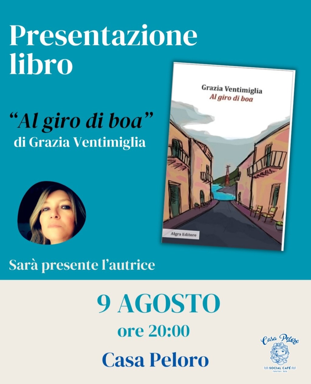 È Casa Peloro la sede prescelta per la presentazione del libro della scrittrice messinese Grazia Ventimiglia dal titolo “Al giro di boa”. La serata trascorrerà all’insegna della Letteratura e dell’introspezione. Appuntamento fissato il 9 agosto alle ore 20:00.