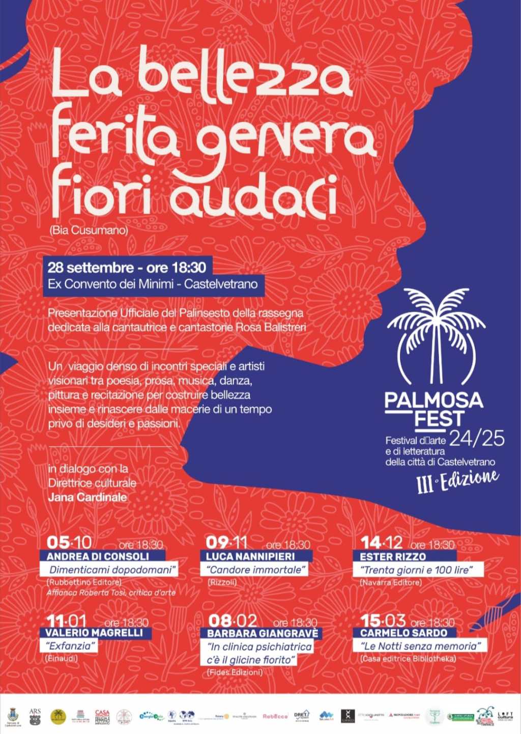 Ad organizzare la manifestazione (che fa parte della Rete dei festival letterari del trapanese) è l’associazione «Palmosa-Kore», presieduta da Bia Cusumano: «Castelvetrano – ha detto – è bellezza sfregiata, ferita, ma da questa ferita, dalla sua cicatrice, può nascere bellezza». D’altronde «La bellezza ferita genera fiori audaci» è la frase-manifesto pensata da Bia Cusumano per questa terza edizione che è idealmente dedicata alla cantautrice e cantastorie siciliana Rosa Balistreri. La ragione l’ha spiegata la vicepresidente del sodalizio, Gisella Mastrantoni: «Rosa Balistreri è stata una donna che ha sofferto, che ha patito, ma ha avuto la forza di trasformare le sua sofferenza in arte immortale. Noi vogliamo celebrare quest’arte».