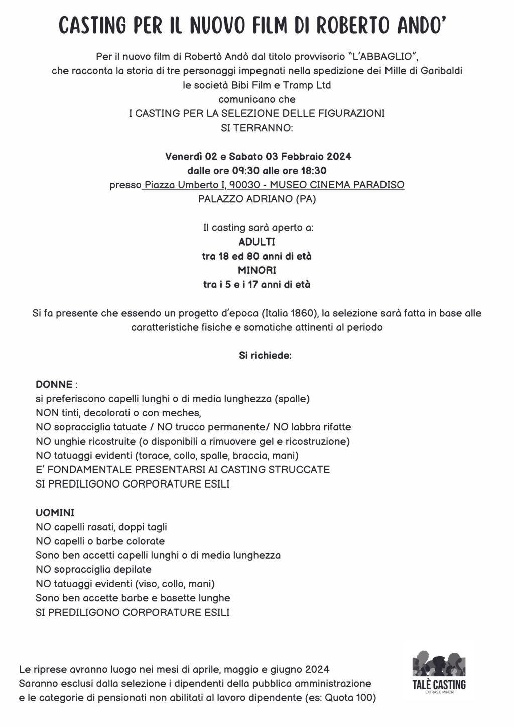 Si fa presente che essendo un progetto d’epoca (Italia 1860), la selezione sarà fatta in base alle caratteristiche fisiche e somatiche attinenti al periodo