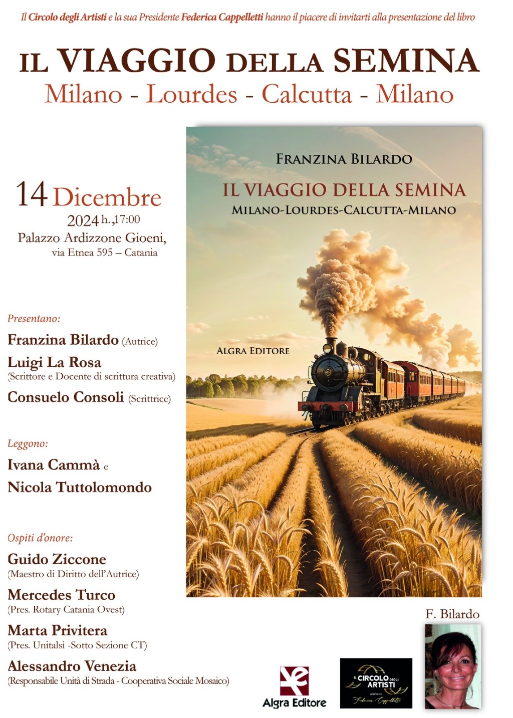 Sabato 14 dicembre 2024, alle ore 17:00, presso il prestigioso Palazzo Ardizzone Gioeni, in via Etnea n. 595 a Catania, si terrà la presentazione del romanzo Il Viaggio della Semina. Milano – Lourdes – Calcutta – Milano (Algra Editore) di Franzina Bilardo.