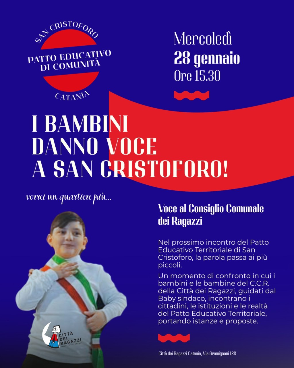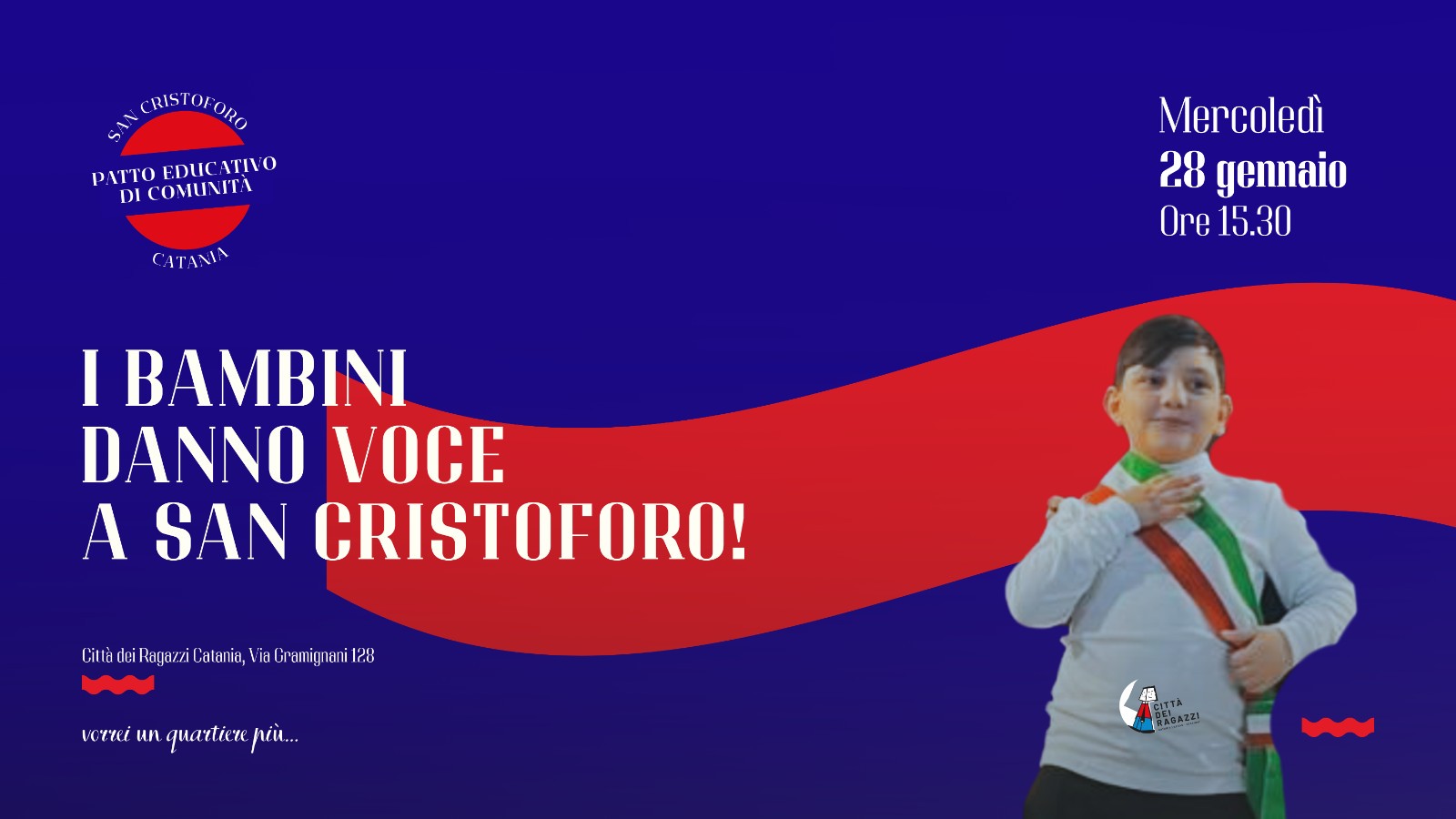 È questo l’obiettivo dell’incontro dal titolo “I Bambini danno Voce a San Cristoforo”, promosso dal Patto Educativo Territoriale di San Cristoforo, in programma mercoledì 28 gennaio alle ore 15.30 presso la Città dei Ragazzi, in via Gramignani 128, a Catania.