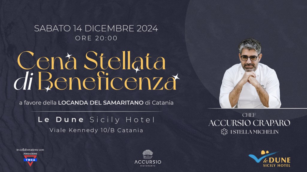 Immaginate una serata speciale, dove i profumi inebrianti della cucina stellata incontrano la magia di un tramonto sul mare. È questa l’atmosfera che vi accoglierà il prossimo 14 dicembre alle ore 20:00, nel salone principale panoramico de Le Dune Sicily Hotel di Catania, (Viale Presidente Kennedy 10/b). Una cornice suggestiva, scelta dalla Fondazione Ymca Italia per ospitare una cena stellata di beneficenza, guidata dallo chef Accursio Craparo, simbolo dell’eccellenza culinaria siciliana e premiato con una stella Michelin.