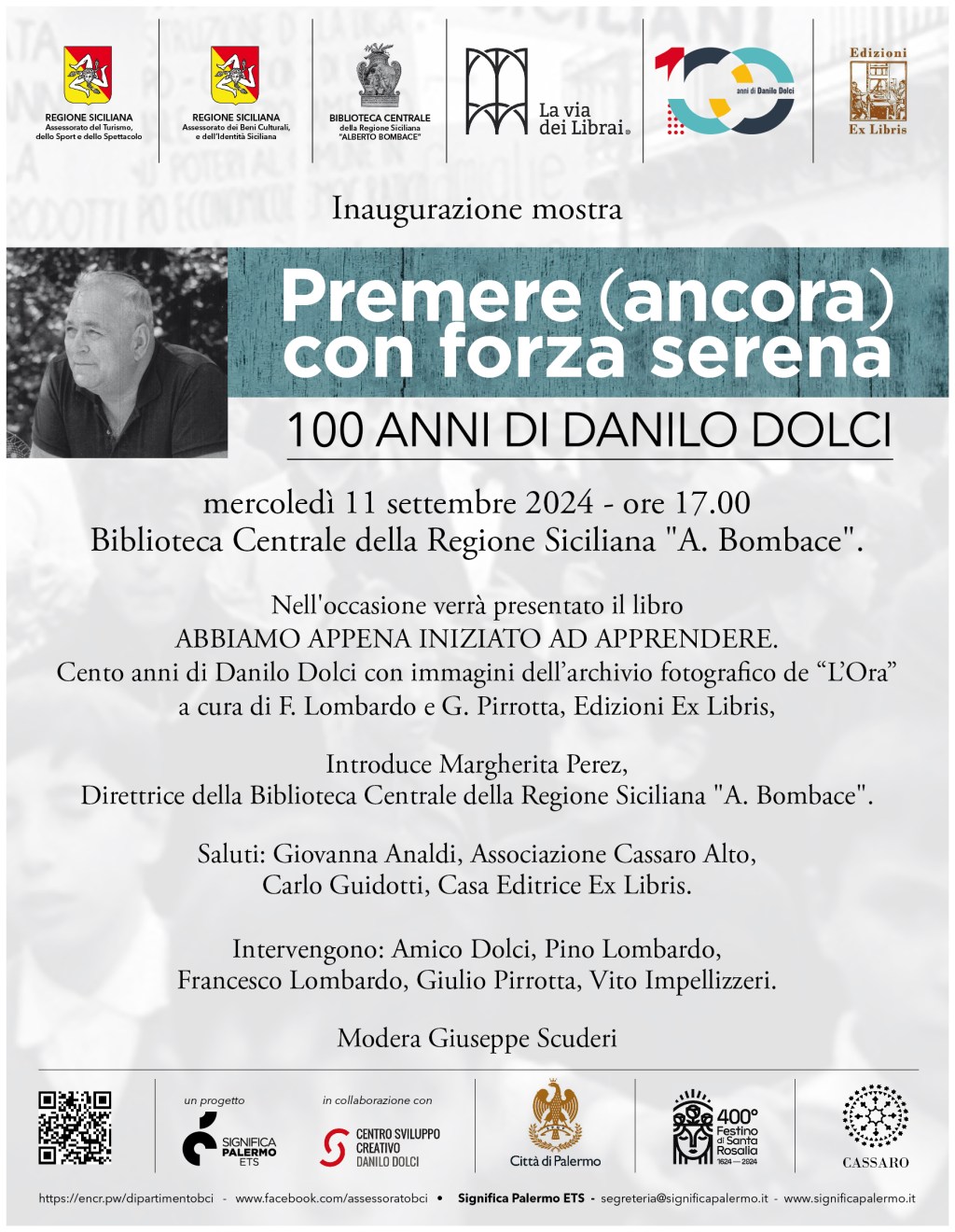 Inaugurazione l’11 settembre 2024 alle ore 17 alla Biblioteca Centrale della Regione Siciliana “A . Bombace” in via Vittorio Emanuele 463 a Palermo della mostra fotografica “Premere (ancora) con forza serena – 100 anni di Danilo Dolci”. Inoltre nell’occasione sarà presentato il libro “Abbiamo appena iniziato ad apprendere” Cento anni di Danilo Dolci a cura di F. Lombardo, e Giulio Pirrotta, Edizioni Ex Libris con immagini tratte dall’archivio fotografico de “L’Ora”. L’intenso momento culturale è introdotto da Margherita Perez, Direttrice della Biblioteca Centrale della Regione Siciliana “A . Bombace”.