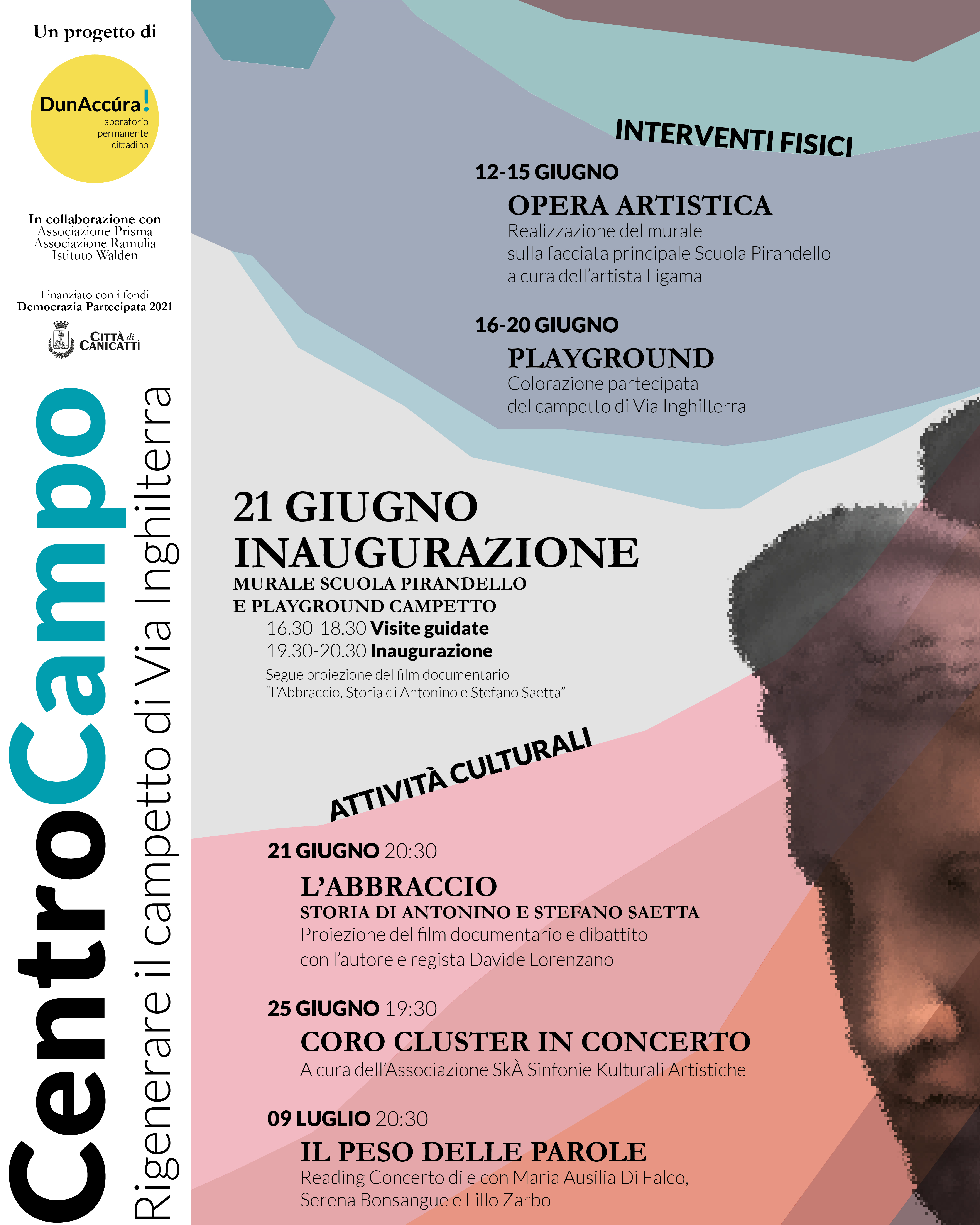 - il 21 giugno le visite guidate del campetto e del murale (in orario 16:30-18:30), a cui faranno seguito l’inaugurazione del campetto (alle ore 19:30) e la proiezione con dibattito del film documentario “L’Abbraccio. Storia di Antonino e Stefano Saetta” del giornalista e regista canicattinese Davide Lorenzano (dalle ore 20:30). Primo evento della rassegna, il film documentario verrà proiettato per la prima volta in pubblico, fuori dalle mura del Teatro Sociale e delle Istituzioni per essere restituito alla cittadinanza canicattinese e poter stimolare pensieri e riflessioni sulla mafia. Contestualmente alla proiezione de “L’Abbraccio”, il dibattito con il regista contribuirà a (ri)avvicinare la figura di Antonino Saetta alla città di Canicattì, in un’opera di memoria e impegno essenziale per contrastare il dilagare del sommerso fenomeno mafioso;