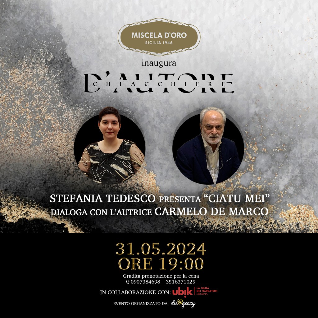 Il prossimo 31 Maggio, all’interno dell’esclusiva location di Miscela d’Oro, Chiacchiere d’Autore ospita Stefania Tedesco, autrice messinese d’azione, che presenta la sua ultima fatica letteraria, “Ciatu mei. Seconda indagine per Cecilia Orlandi” (Scatole parlanti Editore). Un giallo ironico e irriverente che porta i lettori alla scoperta delle storie e delle intricate indagini della protagonista tra le strade di Roccia Marina. A dialogare con l’autrice Carmelo De Marco, avvocato, giurista e autore, vincitore del Premio Lugano per “2024 – La Bussola e i portici” (Europa Edizioni).