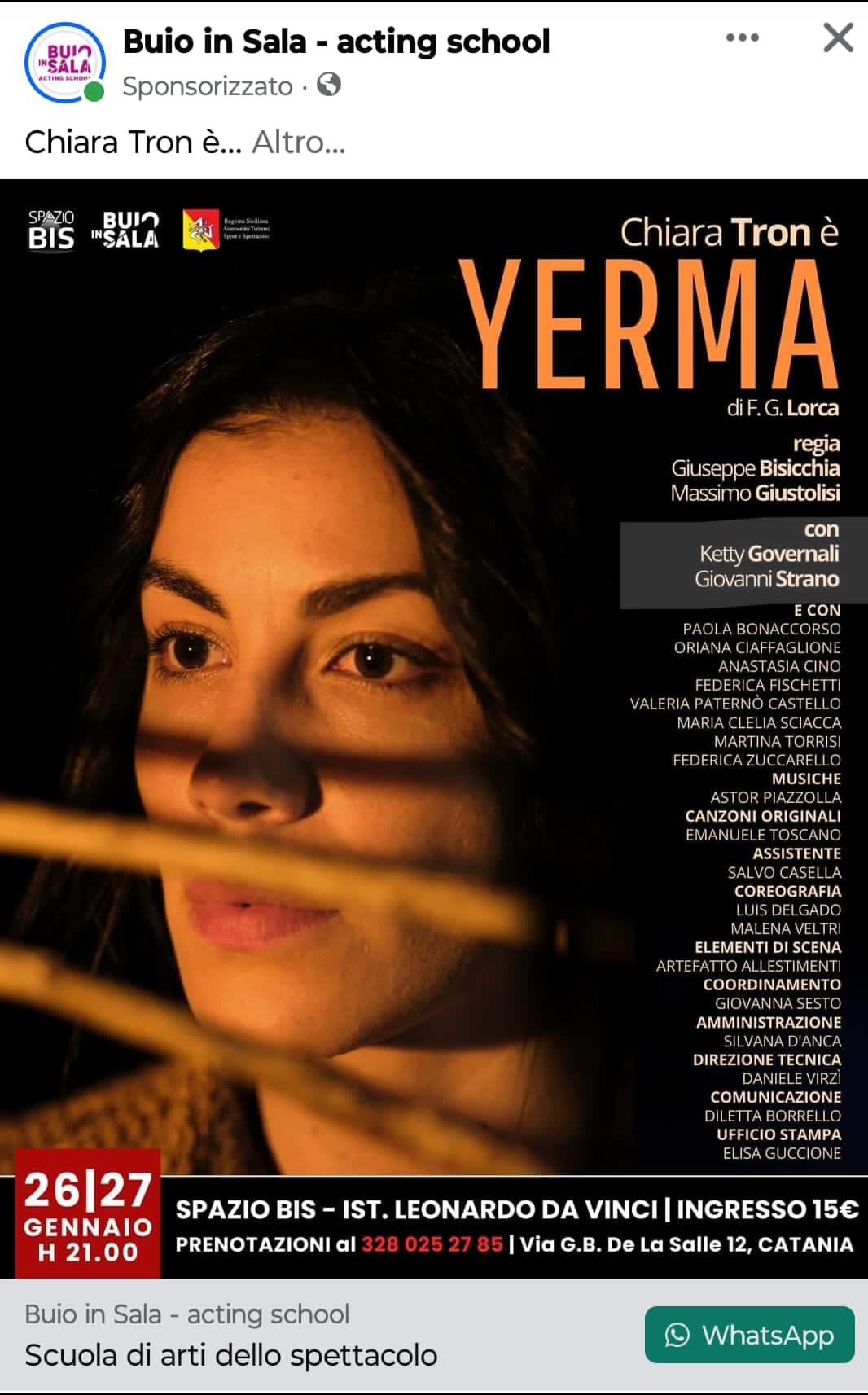 La liricità della scrittura di Federico Garcia Lorca nel raccontare la disperazione del dramma di “Yerma” rivivrà venerdì 26 gennaio e sabato 27 gennaio, alle ore 21.00, sul palco di Spazio Bis per il cartellone “Classici Sguardi”, dedicato ai grandi autori del Teatro, per la Compagnia Buio in Sala fondata dagli attori e registi Massimo Giustolisi e Giuseppe Bisicchia insieme a Silvana D’Anca e Giovanna Sesto.