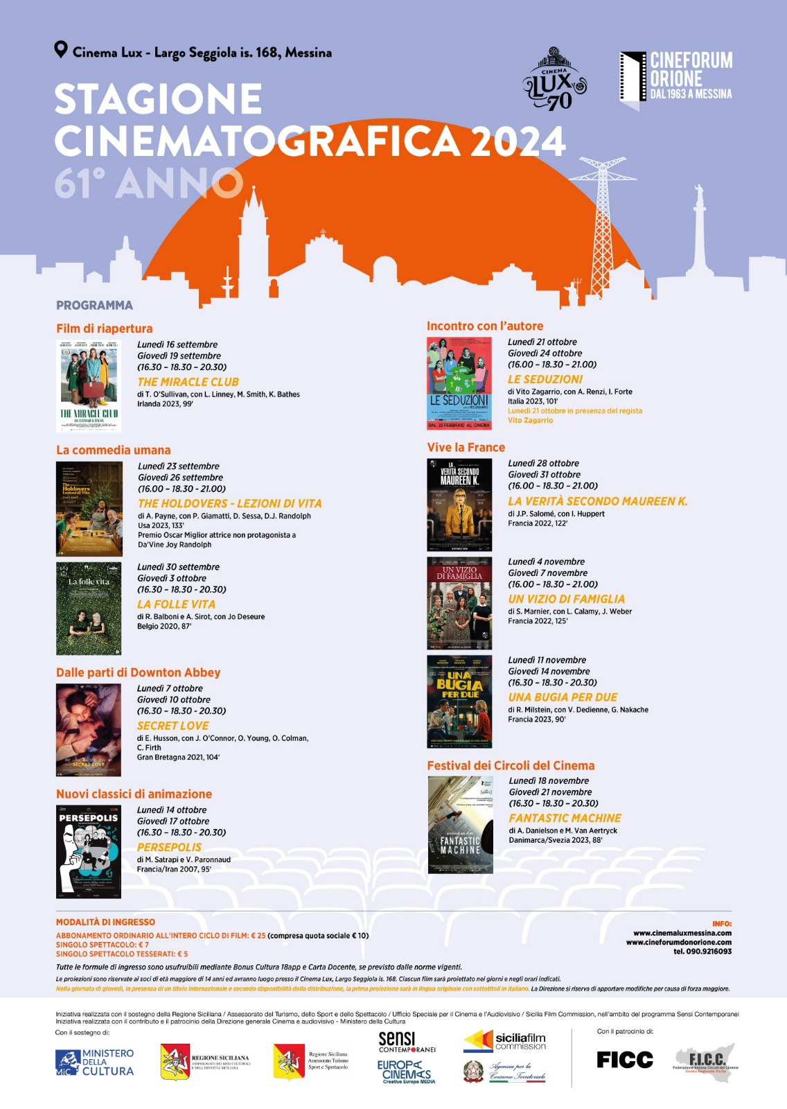 Gli abbonamenti sono già in vendita presso il Cinema Lux. Il programma si svolge con l’intervento di Europa Cinemas, del Ministero della Cultura e della Regione Siciliana – Assessorato dei Beni Culturali e dell’Identità Siciliana e Assessorato Turismo Sport e Spettacolo – e con il patrocinio gratuito della FICC (Federazione Italiana Circoli del Cinema), realtà alla quale aderisce lo stesso Cineforum Orione.