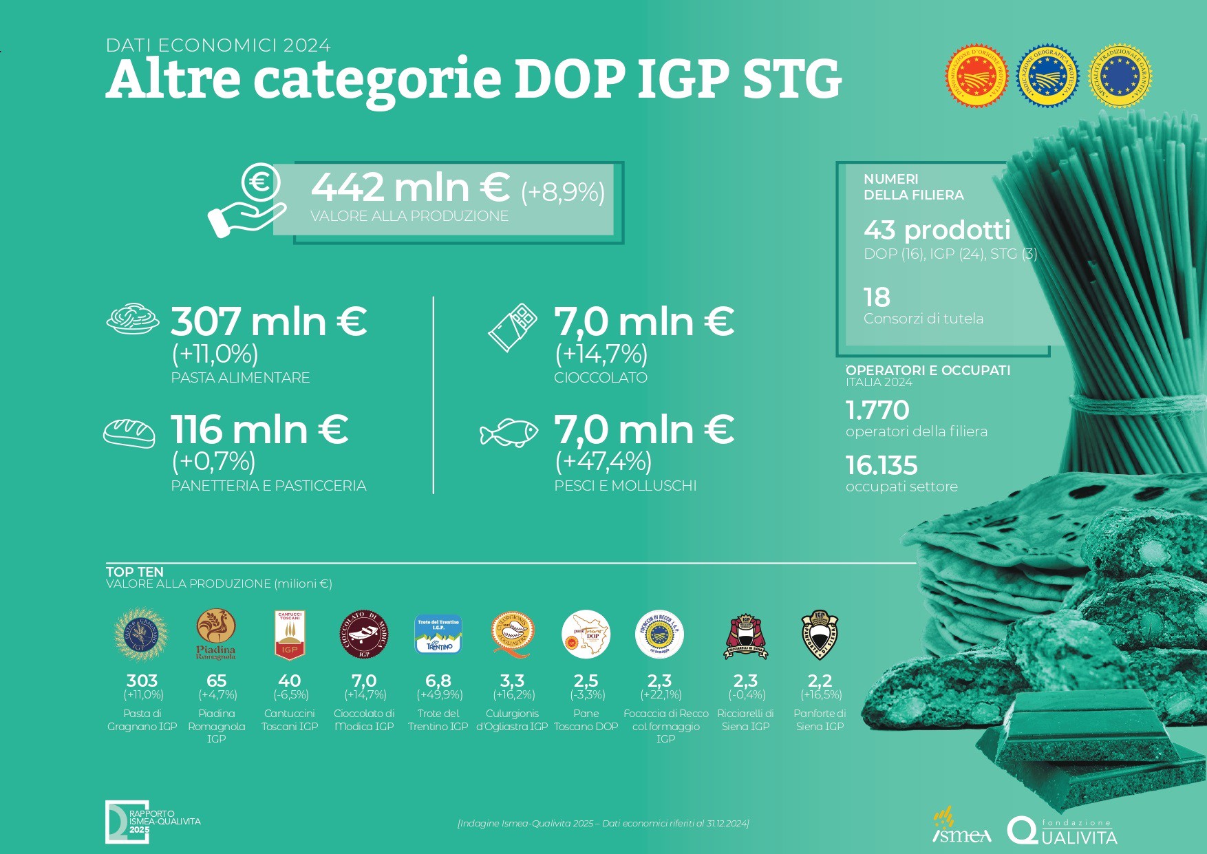 Il Rapporto evidenzia una crescita della Dop Economy (+3,5% su base annua), registrando una crescita del +25% rispetto al 2020.