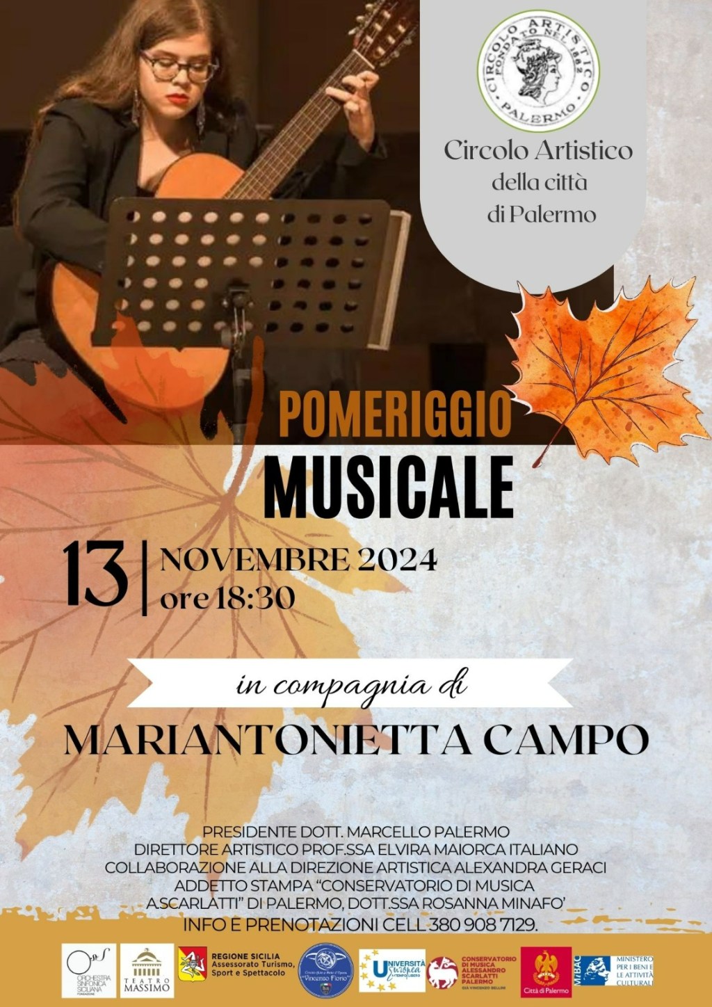 Il Circolo Artistico Città di Palermo, fondato nel 1882, con il presidente dott. Marcello Palermo, organizza un pomeriggio speciale in musica. Il 13 novembre alle 18:30 si realizzerà un nuovo evento all’insegna della buona musica, con il concerto “Pomeriggio Musicale”. Continua così il ciclo delle attività all’interno del Circolo che porta la firma della direzione artistica della professoressa Elvira Maiorca Italiano, la collaborazione artistica Alexandra Geraci, la segretaria Domenico Ruisi.