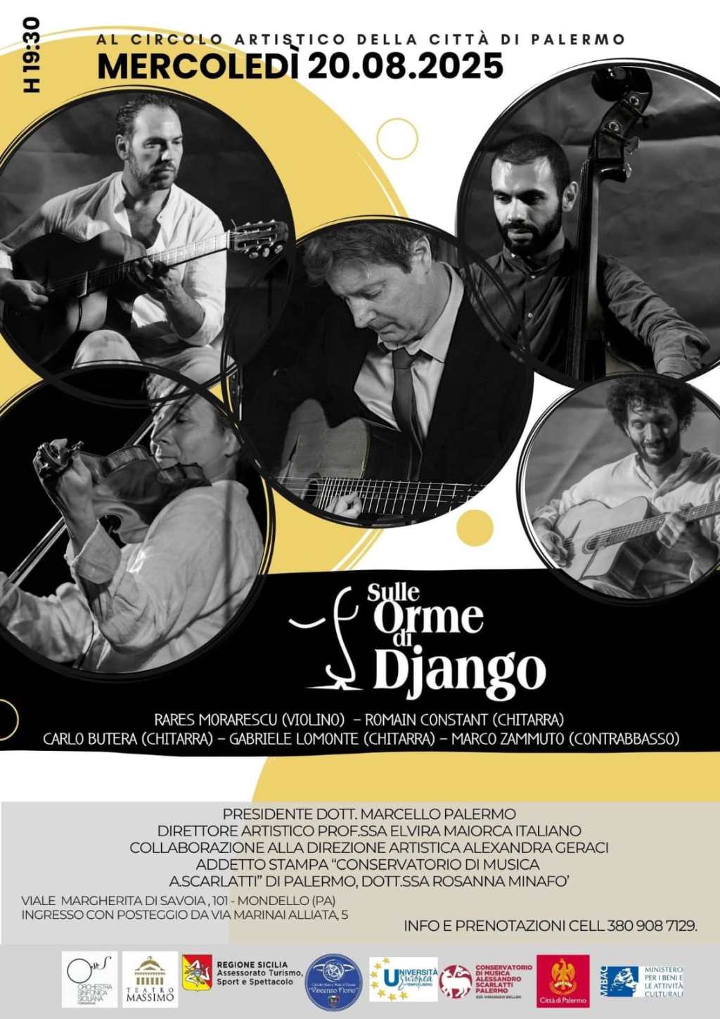 Continua con successo l’attività culturale e musicale al Circolo Artistico Città di Palermo, fondato nel 1882, con il presidente dott. Marcello Palermo, grazie all’appuntamento voluto fortemente dalla direzione artistica, Elvira Maiorca Italiano, con lo spettacolo “Sulle Orme di Django” con Romain Constant, Carlo Butera, Gabriele Lomonte (chitarre), Marco Zammuto (contrabbasso) e, tra questi grandi nomi, siamo onorati di ospitare il violinista di fama internazionale Rares Morarescu. Continua così il ciclo delle attività all’interno del Circolo che porta la firma della professoressa Elvira Maiorca Italiano, la collaborazione artistica Alexandra Geraci, la segretaria Domenico Ruisi.