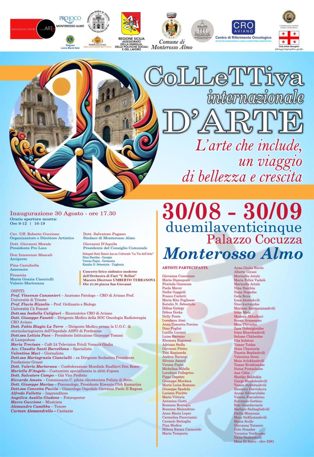 Monterosso Almo (Rg) – Sarà inaugurata sabato 30 agosto, con inizio alle ore 17.30, la Collettiva internazionale “L’Arte che include, un viaggio di bellezza e crescita” presso palazzo Cocuzza a Monterosso Almo, in occasione del Giubileo degli Artisti che vedrà la presenza del vescovo mons. Giuseppe La Placa. L’iniziativa è organizzata dalla Pro Loco di Monterosso Almo in collaborazione con l’associazione La Via dell’Arte con il patrocinio della Regione Sicilia per il tramite dell’Assessorato alla Famiglia, delle Politiche sociali e del lavoro, del comune di Monterosso Almo, dell’Istituto nazionale Tumori-Cro di Aviano, della Confederazione mondiale degli Exallievi ed Exallieve di Don Bosco e dalle locali Parrocchie.