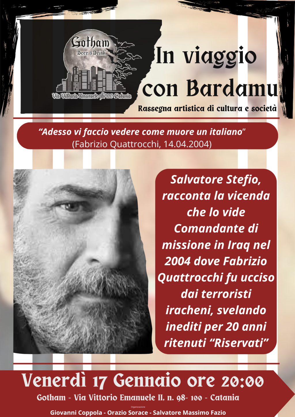 L’incontro avrà un ospite d’eccezione, il Comandante della missione dei Contractor in Iraq nel 2004 Salvatore Stefio, oggi Security Manager e che all’epoca dovette subire il sequestro per 58 giorni dove venne ucciso il proprio commilitone Fabrizio Quattrocchi per mano degli assassini iracheni. Salvatore Stefio, si racconterà in quella che è l’esperienza che più di ogni altra ha segnato la propria vita professionale: prima a supporto e difesa dei civili impiegati nelle operazioni di ricostruzione, poi, dopo l’omicidio politico di Quattrocchi ebbe a subire le polemiche di buona parte di schieramenti politici progressisti che appellarono lo stesso con gli altri tre colleghi come mercenari. Ma non si dimentica che in quegli anni una punta di diamante della sinistra italiana, Massimo D’Alema, ebbe a dichiarare che se non fossero proprio i contractor italiani a difendere chi altro doveva essere? Una questione molto triste che diede modo di far emergere come la demagogia di certa sponda politica non riesce a coniugarsi nemmeno con le alte sfere del proprio colore politico. Sal Stefio, dopo la vicenda rafforzò la sua spiritualità pubblicando anche il libro “Verso il regno interiore” che narra un cammino interiore indirizzato dal suo vecchio amico Liam, persona intelligente che molta risoluzione e riflessione diede al nostro ospite. L’occasione coinciderà anche con la chiusura della mostra di pittura dello stesso Stefio, che è stata inaugurata l’ 11 dicembre scorso, nella galleria artistica del Gotham. Sarà un incontro particolarissimo, che permetterà al pubblico di conoscere anche alcuni misteri che furono ritenuti “Riservati” e che oggi possono essere svelati.
