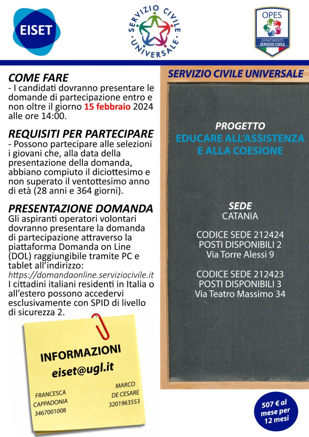 Si chiuderà alle 14 del prossimo 15 febbraio la possibilità, per i giovani aspiranti volontari, di candidarsi per partecipare al Servizio civile universale per i progetti che partiranno tra fine 2024 ed il 2025. Tra le sedi che dovranno ospitare i progetti nell’area catanese c’è anche l’Ugl di Catania, con il programma promosso dagli enti Eiset e Opes ed intitolato “Educare all’assistenza e alla coesione”. L’opportunità sarà riservata in tutto a 5 volontari, di cui 3 nella sede di via Teatro Massimo 34 (codice 212423) e 2 nella sede di via Torre Alessi 9 (codice 212424), che già stanno sperimentando con risultati soddisfacenti l’esperienza del Servizio civile universale. Coloro che hanno un’età compresa tra i 18 e i 28 anni (e 364 giorni) e vogliono far pervenire la propria proposta di candidatura, possono ancora farlo attraverso il sito internet del Dipartimento nazionale delle Politiche giovanili e il Servizio civile universale, all’indirizzo https://domandaonline.serviziocivile.it. E’ necessario però essere in possesso di Spid di livello 2 e di curriculum vitae. Per eventuali informazioni e per richieste di chiarimento, oppure per fissare un appuntamento per ricevere assistenza alla compilazione del form di domanda, la Segreteria territoriale Ugl è a disposizione telefonando allo 095 325863 (dal lunedì al venerdì dalle 10.30 alle 12.00) oppure tramite e-mail all’indirizzo serviziocivile@ugl-catania.it.