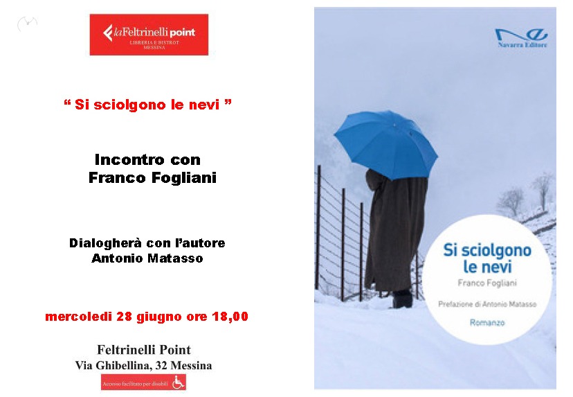 Sarà presentato mercoledì 28 giugno alle 18 a Messina, presso la libreria Feltrinelli di via Ghibellina 32, il romanzo storico di Franco Fogliani dal titolo “Si sciolgono le nevi”, terzo classificato al Premio letterario internazionale “N. Giordano Bruno”, da poco assegnato nella città dello Stretto. Il volume, edito dai tipi di di Navarra Editore, prestigiosa casa editrice palermitana, narra vicende collocate al tempo della Resistenza antifascista. L’autore dialogherà con il docente universitario Antonio Matasso, che ha curato la prefazione e presiede FIAP Sicilia, il comitato regionale della Federazione Italiana Associazioni Partigiane.