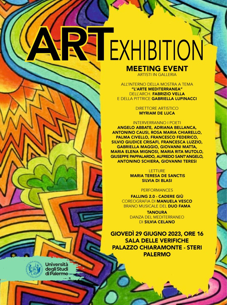 Nella Sala delle Verifiche di Palazzo Chiaramonte – Steri a Palermo, in piazza Marina 61, si è inaugurata lo scorso 20 giugno una mostra di “Archipittura“, che raccoglie realizzazioni progettuali e architettoniche di Fabrizio Vella e opere pittoriche, acquerelli e tecniche miste della pittrice Gabriella Lupinacci dal tema “L’Arte Mediterranea”. La mostra sarà fruibile fino al 30 giugno e, all’interno della stessa, giovedì 29 giugno, alle ore 16, avrà luogo un evento nell’evento con artisti in Galleria, ideato e organizzato dalla pittrice Gabriella Lupinacci; direttore artistico Myriam De Luca, che presenterà anche la manifestazione.