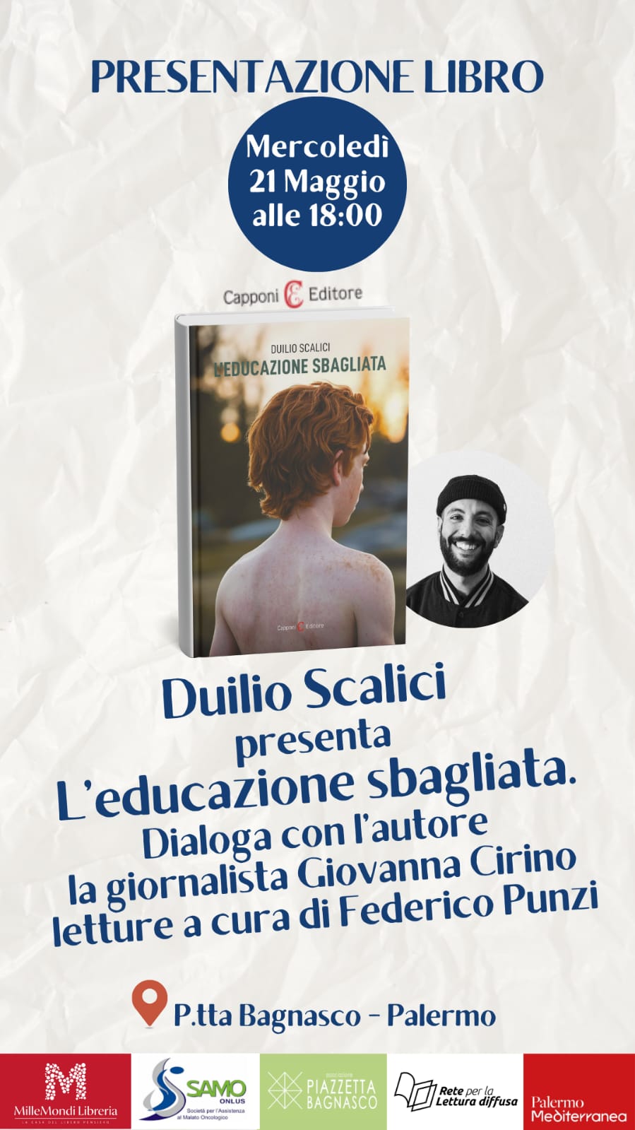 S’intitola “L’educazione sbagliata” (Capponi editore) il libro di Duilio Scalici che sarà presentato alle 18 di mercoledì 21 maggio in piazzetta Bagnasco. Dialoga con l’autore Giovanna Cirino. Letture a cura di Federico Punzi.
