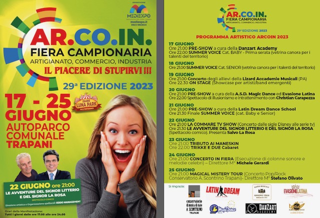 la 29esima edizione della Fiera Campionaria Ar.Co.in di Trapani. Non solo esposizioni e presentazioni di varietà di categorie merceologiche ma anche un ricco programma con eventi di intrattenimento ogni sera.
