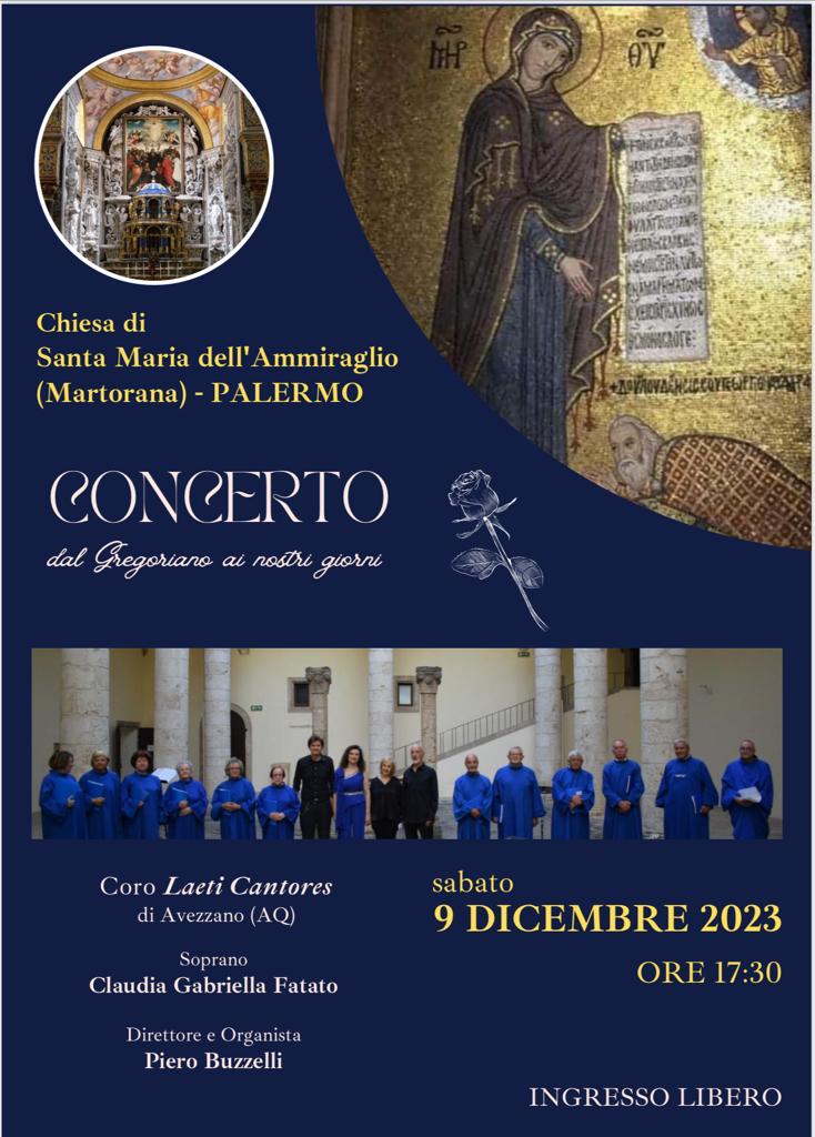 sabato 9 dicembre 2023 alle ore 17.30 avrà luogo, presso la Chiesa di Santa Maria dell’Ammiraglio – la Martorana – di Palermo, un concerti di canti Gregoriani a cura del Coro “Laeti Cantores” di Avezzano (AQ).