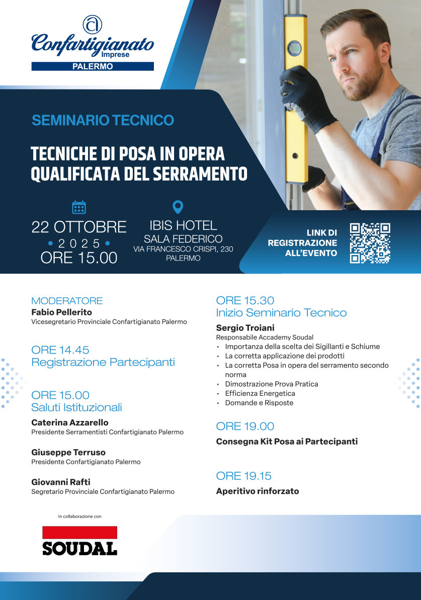 «Abbiamo voluto inaugurare la nuova stagione con un evento fondamentale per il nostro settore – spiega Caterina Azzarello – e il seminario rappresenta un’occasione preziosa per approfondire le tecniche di posa qualificata dei serramenti, un aspetto cruciale per chi vuole distinguersi per professionalità e qualità del lavoro. Partecipare significa aggiornarsi sulle migliori pratiche e sulle tecnologie più innovative, ma anche confrontarsi con altri operatori del settore e rafforzare la rete di competenze che caratterizza Confartigianato Palermo».