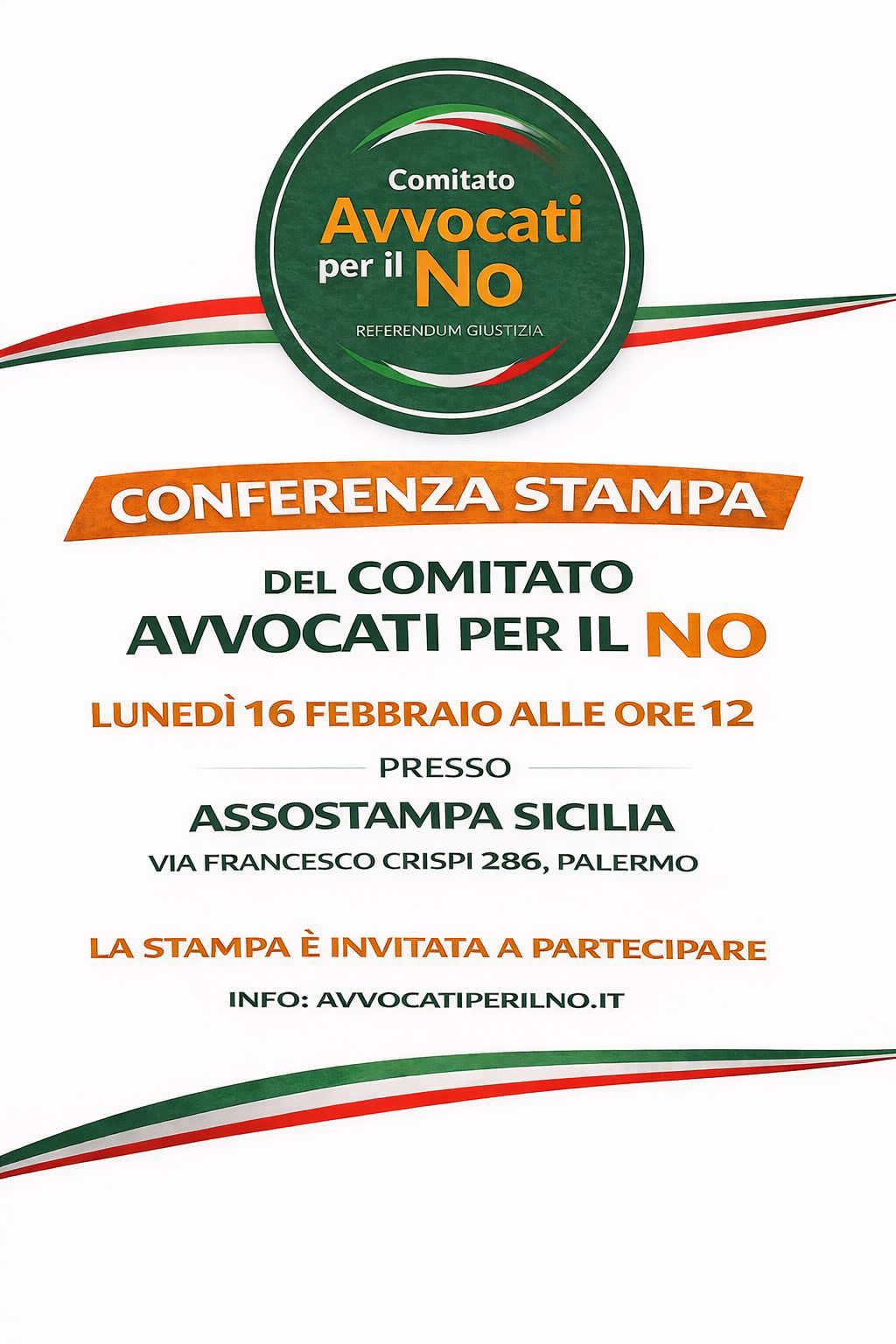 Lunedì *16 febbraio* alle *ore* *12,00* presso la sede di *Assostampa Sicilia* (via Francesco Crispi, 286 – Palermo) si terrà la conferenza stampa di presentazione del *Comitato Avvocati per il NO – Palermo*.