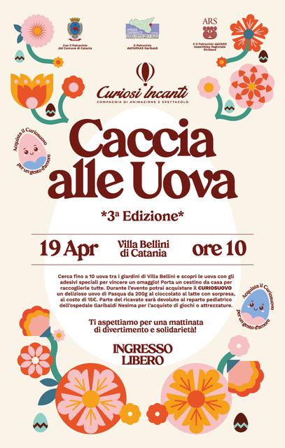 L’evento, gratuito e patrocinato da Ars e Comune di Catania, si svolgerà sabato 19 aprile alle ore 10 alla Villa Bellini di Catania. Una Pasqua allegra e quest’anno anche solidale grazie al “CuriosUovo”, un uovo artigianale di fine cioccolato al latte. Parte del ricavato delle vendite andranno a favore del reparto di pediatria dell’Arnas Garibaldi Nesima.