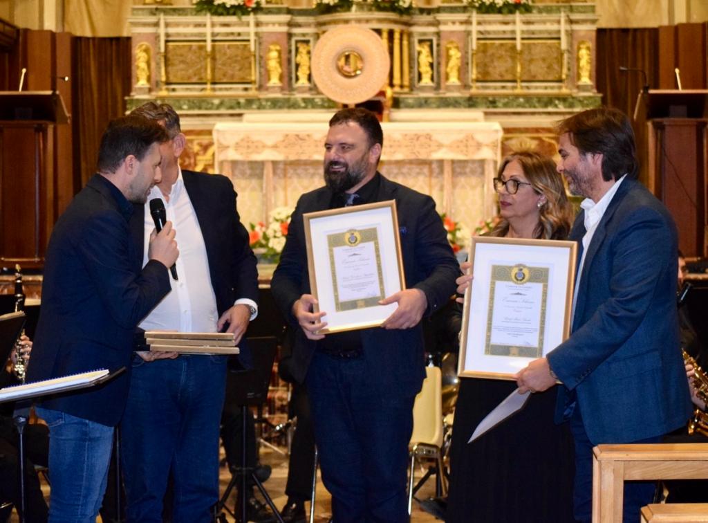 E ’stato un epilogo in arte, musica e solidarietà quello proposto per congedare la seconda edizione di “Giarre città educativa”, promossa dall’assessorato alle Pari Opportunità e P.I del Comune di Giarre, sotto l’egida del Ministero della Cultura e dell’ARS. A chiudere il cartellone di eventi culturali che hanno animato la città per un oltre un mese, con concerti, mostre, incontri con le scuole, arte e teatro, il concerto dell’orchestra dei fiati del conservatorio “A. Scarlatti” di Palermo, ospitato, nel monumento simbolo della città il Duomo. Un organico composto tutto da allievi dell’antica istituzione musicale palermitana, formata dalla sinergia tra diversi dipartimenti: fiati, percussioni e direzione d’orchestra e che, diretti dai maestri: Vincenzo Baldone e Gaetano Ortolano, hanno dato prova di eleganza e assoluto dinamismo suscitando il plauso dei presenti, proponendo un repertorio sinfonico con opere classiche di Bellini, il palermitano Ortolano, Verdi, nella prima parte e riservando una seconda parte ad opere più contemporanee, come la “Danza del sol”, “James Bond” e “Fra suoni e mani”, facendo intervenire, nell’ esecuzione del brano, il pubblico presente, sotto il coordinamento del maestro Salvatore Palmeri, docente del Conservatorio “A. Scarlatti”. In programma per l’occasione il conferimento da parte del sindaco dott. Leo Cantarella di due encomi solenni, a nome della città. Uno al direttore artistico di “Giarre città educativa” e docente ordinario presso il Conservatorio “A. Scarlatti” di Palermo, Gianfranco Pappalardo Fiumara, reduce da importanti successi fra i quali i concerti tenuti al Conservatoire Royal di Bruxelles, al Conservatorio di Parigi, alla Sorbona di Parigi ed alla Carnegie Hall di New York e l’ altro al neo direttore del Conservatorio palermitano, il professore Mauro Visconti, titolare della cattedra di Direzione di coro e composizione corale del Conservatorio “A. Scarlatti” di Palermo, responsabile dell’organizzazione didattica del Conservatorio. Intensa è la sua attività concertistica, come solista al pianoforte e all’organo, come accompagnatore di cantanti lirici e gruppi corali, in formazioni cameristiche, in qualità di direttore di coro e d’orchestra. Ed oggi alla guida della più importante istituzione musicale siciliana. Nella stessa serata è stata l’arte visiva protagonista con il maestro Emanuele India che ha esposto tre installazioni, nate dall’alchimia di colori e segni, frutto di tecniche e saperi che attingono ad una sapienza antica e ad una cultura millenaria. “Noi ci troviamo nel Duomo – ha detto il referente culturale di Giarre città educativa, l’ispettore regionale BB.CC, Nicolò Fiorenza- che è già un gioiello dell’architettura siciliana di metà ottocento e che ha ospitato al suo interno queste opere, fatte giungere da Palermo, del maestro Emanuele India, che ha impreziosito con tre installazioni di cui un ostensorio e due grandi pannelli dipinti con delle tecniche molto particolari. Un percorso artistico e culturale presente in quest’ edizione del nostro progetto, iniziato con il confronto delle Soprintendenti di Catania e Messina, sul recupero e la tutela del nostro patrimonio ionico etneo e culminato oggi con la prestigiosa presenza di queste opere, per far comprendere quanto comunicare l’arte e la cultura sia davvero importante. Abbiamo voluto iniziare questo concerto – ha evidenziato Fiorenza- con il ricordo delle vittime di femminicidio, aderendo a “Posto occupato” per gridare il nostro forte no alla violenza di genere, perché fatti così incresciosi, come quelli raccontati in questi giorni, non abbiano più a verificarsi”. Infatti un paio di scarpette rosse, simbolo della lotta per i diritti delle donne contro la violenza di genere, erano in prima fila, per ricordare le vittime di violenza, come la giovane Giulia Cecchettin, il cui omicidio, in questi giorni, ha scosso l’opinione pubblica.
