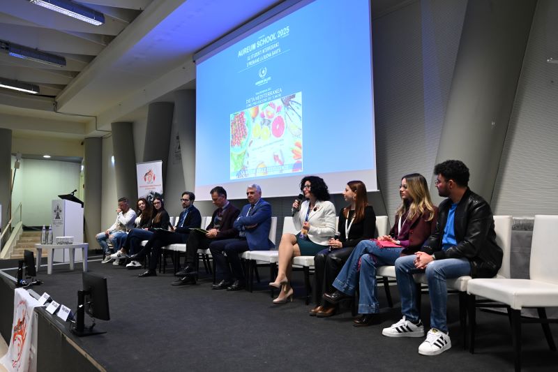 A conclusione del convegno, un evento collaterale ha permesso di presentare la prossima edizione di “Aureum School”, un evento ideato e curato dall’associazione “Belle e Buone Arti” che propone una piattaforma di riflessione comune tra studenti e mondo della sanità. L’evento sul tema “Dieta mediterranea come prevenzione dei tumori” ha visto la presenza di un gruppo di studenti che hanno dialogato con Oriana Licciardello, biologa nutrizionista dell’azienda ospedaliera Policlinico San Marco e Pietro Conti, direttore dell’Unità operativa complessa di Chirurgia generale dell’ospedale Guzzardi di Vittoria. A conclusione, si è svolta la breve cerimonia di premiazione di Aistom Sicilia e Aureum School. Il dottore Salvatore Ragazzi ha premiato Pietro Conti; Antonino Gulino, segretario di Aistom Sicilia ha consegnato il premio a Oriana Licciardello.
