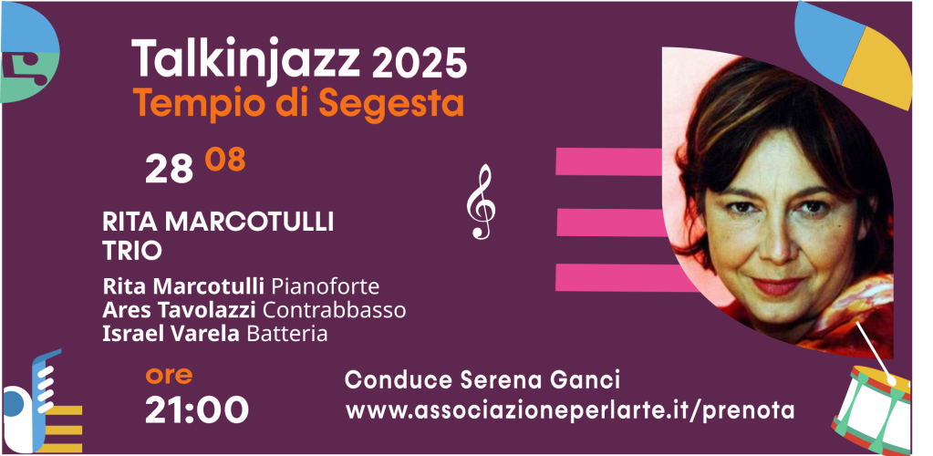 Manca meno di una settimana all’attesa terza edizione, al Tempio di Segesta, di “TalkinJazz”, la tre giorni dedicata alla musica di qualità organizzata dall’Associazione per l’Arte, con il contributo dell’Assessorato Regionale dei Beni Culturali e dell’Identità Siciliana e realizzata in collaborazione con il Parco Archeologico di Segesta. Tre giorni di concerti – il 28, 29 e 30 agosto – in un posto unico al mondo con nomi illustri del panorama jazzistico nazionale e internazionale in cui a conversare con i musicisti sarà l’istrionica attrice e cantante palermitana Serena Ganci. Anche quest’anno l’edizione ha una finalità sociale, realizzata grazie a una convenzione stipulata dall’Associazione per l’Arte con la Diocesi di Trapani.