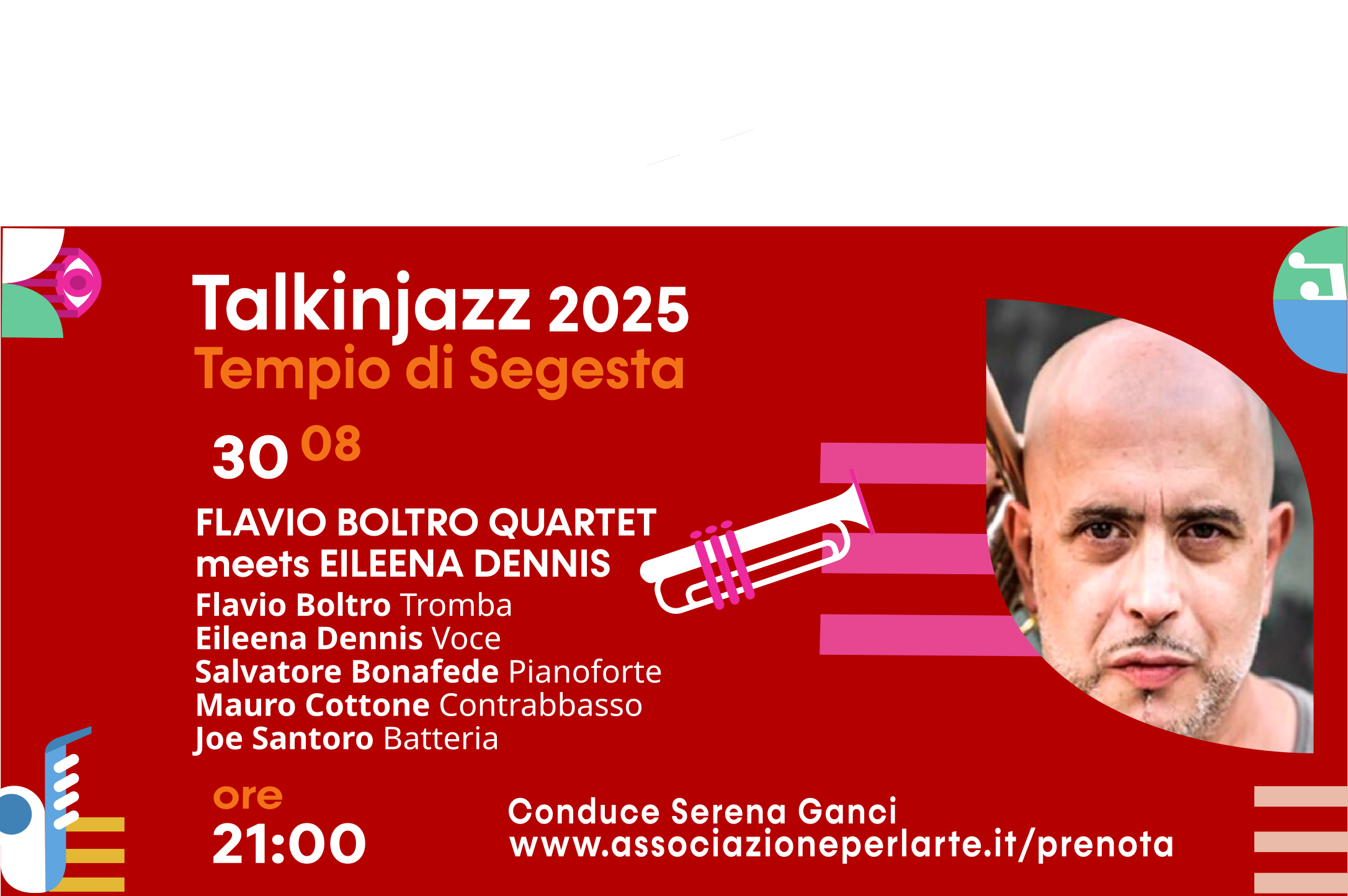 30 AGOSTO – FLAVIO BOLTRO QUARTET meets EILEENA DENNIS (Flavio Boltro – Tromba, Eileena Dennis – Voce, Salvatore Bonafede – Piano, Mauro Cottone – Contrabbasso, Joe Santoro – Batteria)