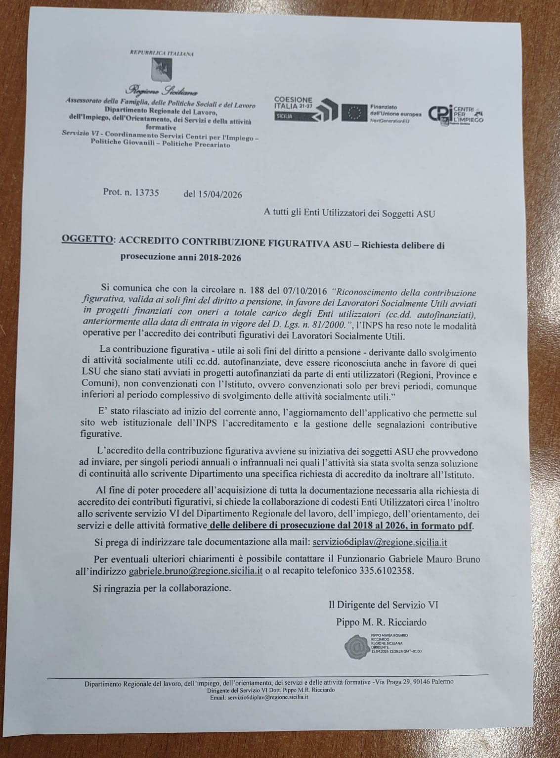 Durante i lavori della I Commissione Affari Istituzionali presso l’ARS, tenutisi in data 14/04/2026, la scrivente O.S. Presente ai lavori; ha rappresentato, oltre alle note criticità relative alla stabilizzazione dei lavoratori ASU/LSU, la questione del mancato caricamento dei contributi figurativi dal 2018 ad oggi. Problematica già segnalata più volte nel corso degli anni, ma rimasta priva di riscontro da parte della politica regionale. Il Presidente della I Commissione, On. Abate, ha formalmente richiesto la predisposizione di una relazione sul tema. USB ha provveduto con tempestività all’invio della stessa, evidenziando l’inadempienza della Regione Siciliana che, a causa del contenzioso in essere con l’INPS, non ha proceduto al caricamento dei contributi figurativi dal 2018. Tale situazione rende questi lavoratori di fatto INVISIBILI ai fini previdenziali.