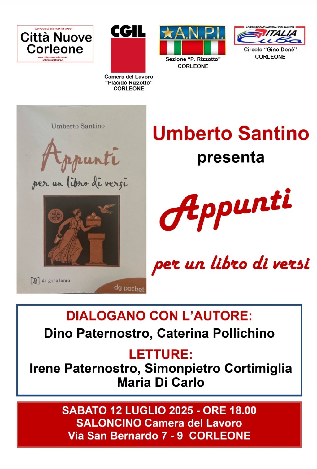 Palermo 9 luglio 2025 – Sarà presentato sabato 12 luglio, alle ore 18, nel saloncino della Camera del lavoro di Corleone, il libro di Umberto Santino “Appunti per un libro di versi” (ed. Di Girolamo, Trapani 2025).