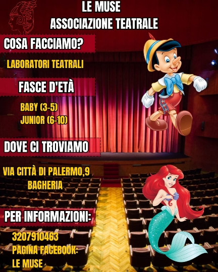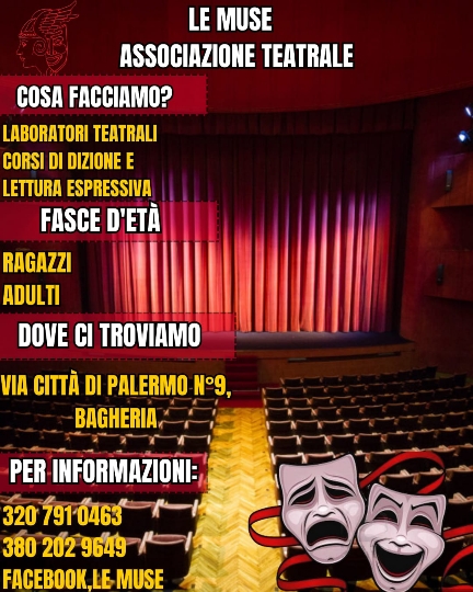 È tempo di rientri e di ritorni. L’associazione teatrale “Le Muse” – via Città di Palermo, 9 a Bagheria – è pronta ad offrirvi un altro anno ricco di formazione, esperienze ed emozioni. Sono ufficialmente aperte le iscrizioni per i nuovi percorsi destinati ai bambini. Attraverso il gioco e gli strumenti che sono alla base della propedeutica teatrale, i più piccoli potranno creare il loro spazio di espressione, contatto e socializzazione. L’associazione teatrale “Le Muse” propone anche i nuovi corsi e laboratori teatrali per ragazzi e adulti, rivolti a tutti coloro che vogliono scoprire e alimentare le proprie capacità espressive. Le tecniche del teatro a servizio della creatività e delle emozioni. Movimento, uso della voce, lettura teatrale e interpretazione per un percorso dinamico ed espressivo che libererà corpo e voce.