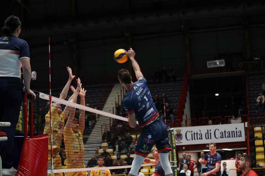 La formazione etnea deve subito fare i conti con l’ottimo stato di forma degli ospiti che in una manciata di minuti scattano in vantaggio. I padroni di casa provano a tenere il passo ma sul 7-11 Placì decide di spezzare il ritmo e chiama time out. I friulani rimangono sul pezzo e continuano a macinare punti. Argenta tenta di impensierire gli avversari firmando un ace (9-13) ed un mani fuori (10-14), Manavì lo sostiene, ma la distanza rimane di quattro lunghezze. Placì concede spazio a Rottman, Lucconi e Orto, che rilevano Basic, Argenta e Manavi. È proprio il neo acquisto ad incidere e riportare sotto i suoi (15-17). Gli ospiti tuttavia riprendono in mano il pallino del gioco e conducono sul 22-25.
