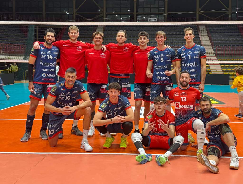 Battocchio risponde con Sottile al palleggio con Maciel, all’esordio, al suo opposto, Codarin e Volpato centrali, Sette e Allik schiacciatorie Cavaccini libero.