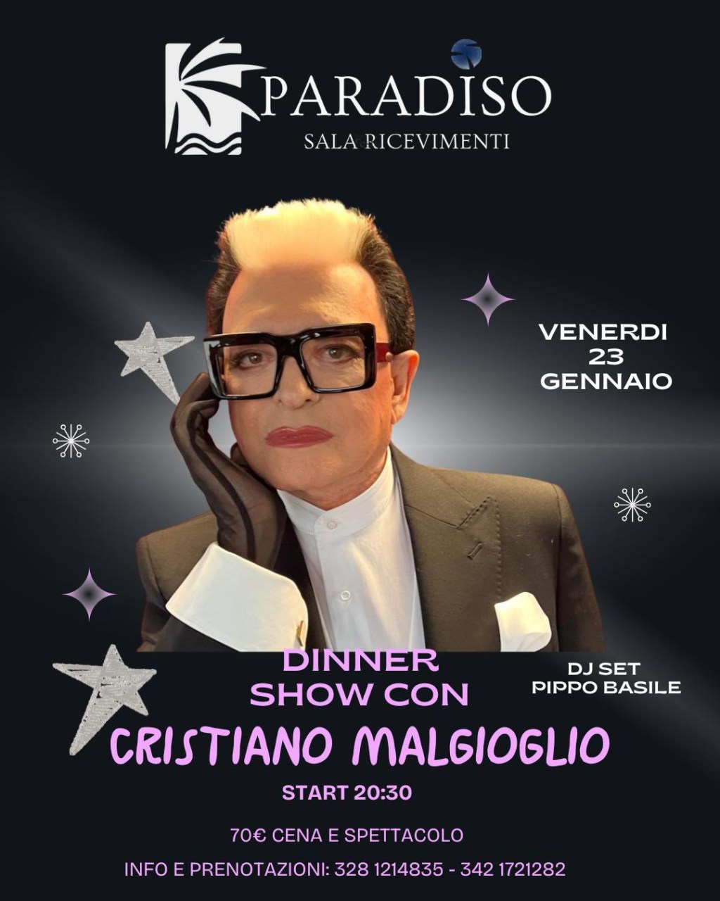 Al Paradiso porterà uno show che è molto più di una semplice esibizione: un incontro diretto con il pubblico, fatto di musica, parole, sorrisi e grande carisma. Al termine della performance di Malgioglio, la serata proseguirà con il DJ set di Pippo Basile, uno dei dj più apprezzati del territorio, che accompagnerà gli ospiti in un viaggio musicale tra anni ’80, ’90 e grandi successi italiani, trasformando il dinner show in una vera festa.
