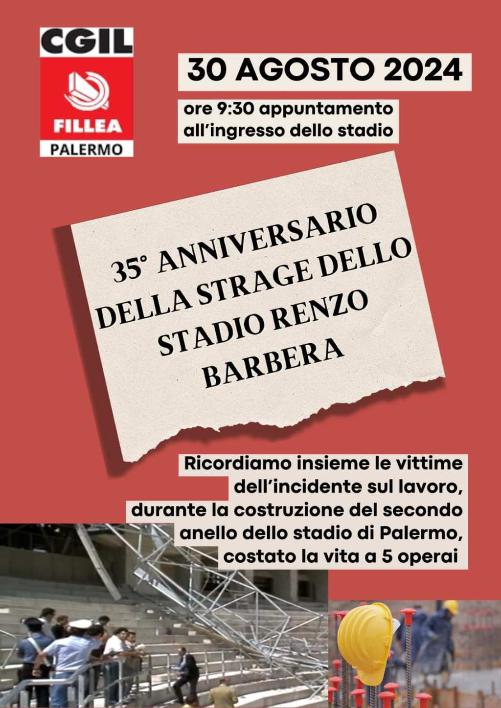 Palermo 28 agosto 2024 – Il 30 agosto è il 35° anniversario del crollo allo stadio e della morte di cinque lavoratori. La Fillea Cgil Palermo dà appuntamento alle 9.30 allo stadio “Renzo Barbera” per ricordare Antonino Cusimano, Serafino Tusa, Giovanni Carollo, Giuseppe Rosone e Gaetano Palmeri, i cinque operai edili morti il 30 agosto 1989 durante i lavori di ampliamento dell’impianto sportivo in vista dei mondiali di calcio di Italia 90.
