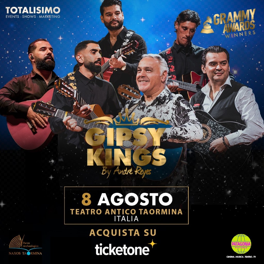 I GIPSY KINGS BY ANDRE’ REYES, in data 8 Agosto 2024 ore 22.00, Teatro Antico Taormina, in concerto, unica data in Italia del tour mondiale.