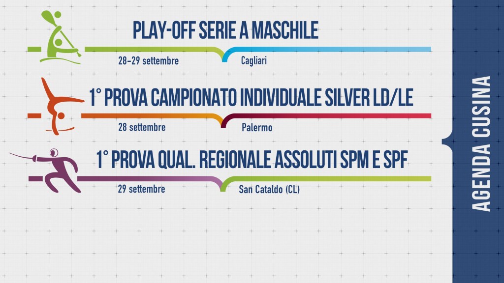 Avvio di stagione anche per la Scherma che domenica 29 settembre a San Cataldo, vedrà impegnati molti schermidori e schermitrici per la 1° prova di Qualificazione Regionale Assoluti. Gara che per alcuni degli atleti presenti, sarà un buon banco di prova per affrontare al meglio le prove del Circuito Europeo Cadetti di spada maschile e femminile in programma il 5 e il 6 ottobre al PalaVesuvio di Napoli, dove i cusini saranno impegnati sia in competizioni individuali che a squadre.