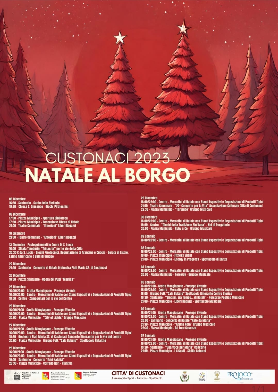 Anche a Custonaci si entra nel vivo dei festeggiamenti di questo Natale 2023 con la manifestazione “Natale al Borgo”. Inaugurata lo scorso 8 dicembre, da venerdì 22 sarà possibile immergersi totalmente nelle atmosfere natalizie grazie al concerto di Natale offerta dall’Orchestra fiati Maria SS. Di Custonaci che si terrà al Santuario alle ore 21:20. Si proseguirà sabato 23 con l’opera dei pupi “Marfisa” a cura della Compagnia Brigliadoro, in programma a Piazza Santuario alle 18. Da lunedì 25, invece, fino a domenica 7 gennaio, a partire dalle ore 16 fino alle 23, il centro di Custonaci ospiterà i mercatini natalizi, con diversi stand espositivi dove sarà possibile degustare diversi prodotti tipici locali. Alle 18, sempre in centro, spettacolo con “Babbo Natale e gli zampognari per le vie del centro” che intratterranno i presenti con musiche tradizionali. Spazio anche ai bambini con il “Villaggio giochi per bambini” attivo dalle 17 alle 20 di lunedì 25, martedì 26 e di sabato 30 dicembre e poi di lunedì 1 e sabato 6 gennaio. Fittissimo il programma degli spettacoli che si concluderanno domenica 7 gennaio con un doppio appuntamento: alle 19:30, al Santuario, si svolgerà il concerto “Una voce per Maria” mentre alle 21, in Piazza Municipio, i 4Gusti insieme a Claudione e Vespertino da Sicilia Cabaret, chiuderanno i festeggiamenti.