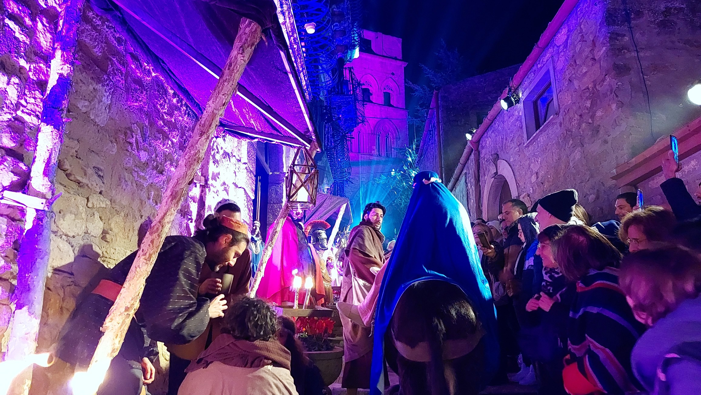 Una magica concentrazione di emozioni, un grande spettacolo che presenta la vita a Nazareth e a Betlemme com’era una volta intrecciandosi con le nobili vestigia della città. A dare forma al presepe ci saranno tutti i personaggi iconici e i richiami ai luoghi della tradizione. Pastori, mercanti, suonatori, venditori ambulanti, lavandaie, artigiani, giocolieri sembreranno “fissati”, nei loro gesti quotidiani, come in un incantesimo. Saranno riproposte spaccati della vita sociale della Palestina del tempo, legate alla presenza militare di Roma imperiale con Erode, la sua corte e i soldati e le sue feste. Scene esclusivamente di carattere religioso. Tra quelle più suggestive l’apparizione dell’Angelo e la fuga dal censimento di Maria e Giuseppe da Nazareth a Betlemme, quest’ultimo quadro, rappresentato nello scenario unico della scalinata che conduce sotto gli archi della Torre trecentesca dei Ventimiglia, dove sarà ricostruita la grotta della natività. Una colonna sonora e una voce fuori campo (ciascuna scena è priva di dialoghi tra gli attori) descriveranno le atmosfere del tipico paesaggio urbano dell’epoca.