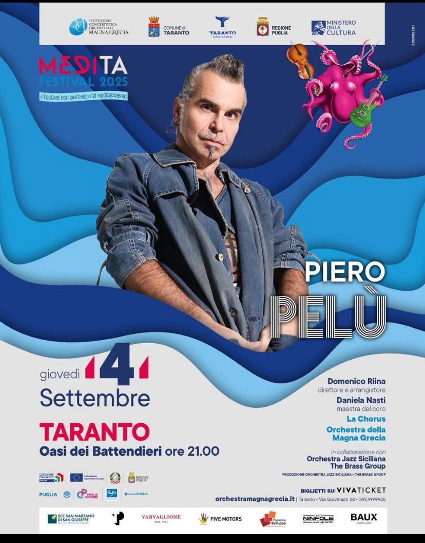 In questo contesto, viene riproposto l’evento straordinario che segna la replica della produzione ine-dita realizzata durante la quinta edizione del Sicilia Jazz Festival promosso dalla Regione Sicilia-na – Assessorato al Turismo, Sport e Spettacolo. Il progetto vedrà nuovamente protagonisti Piero Pelù e alcuni componenti dell’Orchestra Jazz Siciliana con l’Orchestra della Magna Grecia di-retti dal M° Domenico Riina, questa volta sul palcoscenico dell’Oasi Dei Battendieri di Taranto, in occasione del rinomato Medita Festival, giovedì 04 settembre.