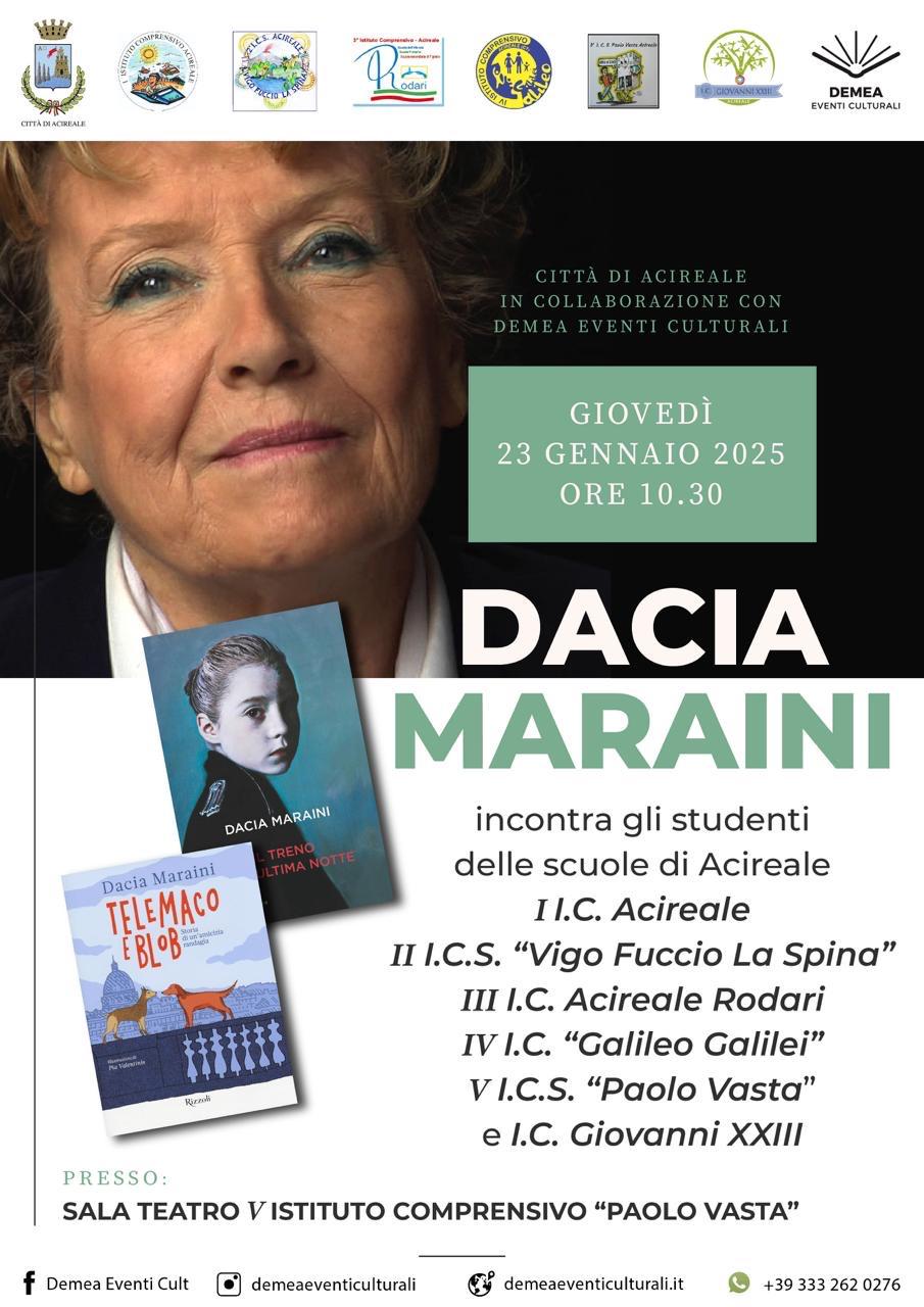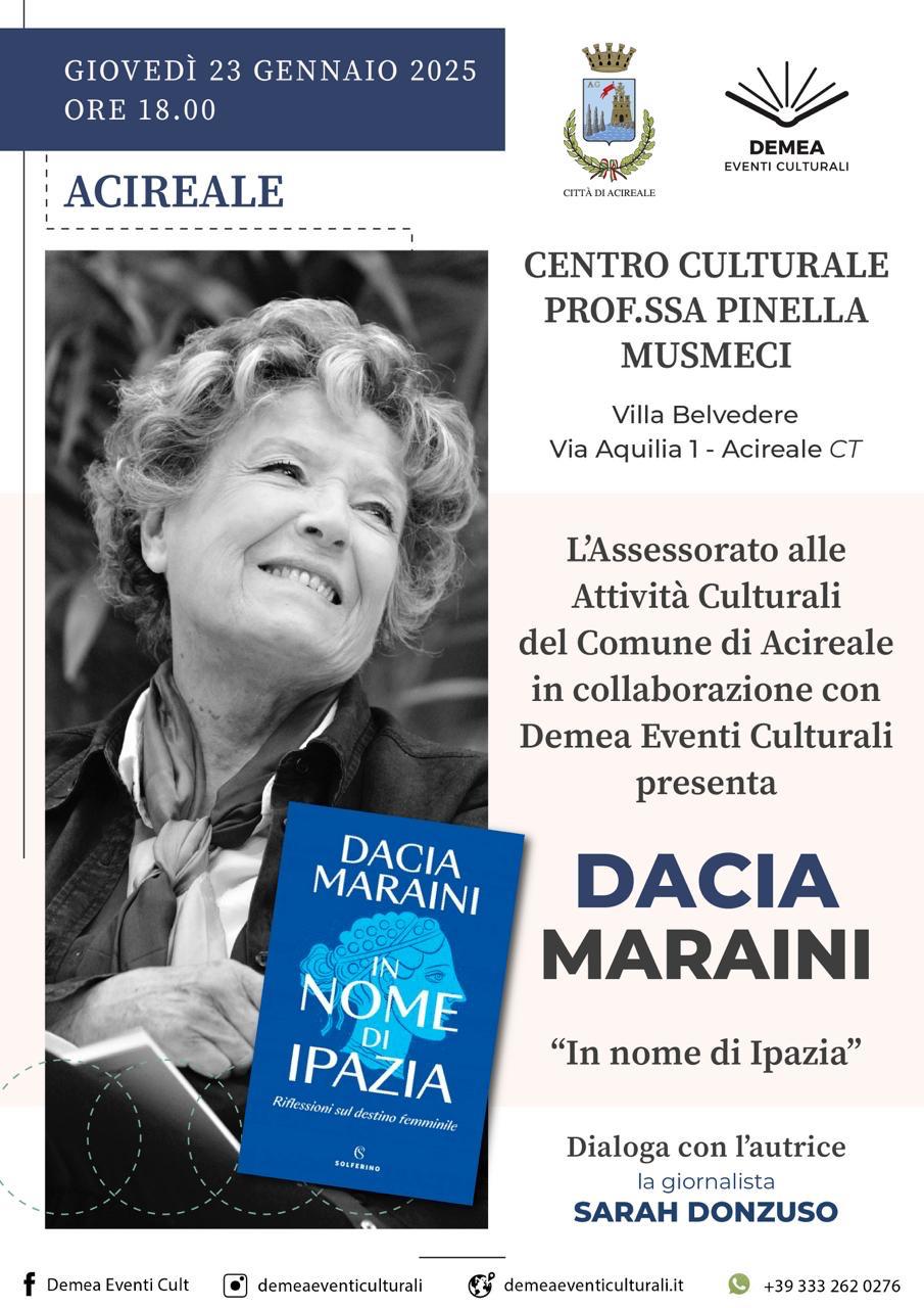Domani, 23 gennaio, Acireale accoglierà con entusiasmo la celebre scrittrice Dacia Maraini. La giornata sarà scandita da tre importanti momenti, organizzati dalla Città di Acireale, Assessorato alle Attività Culturali, in collaborazione con Demea Eventi Culturali.