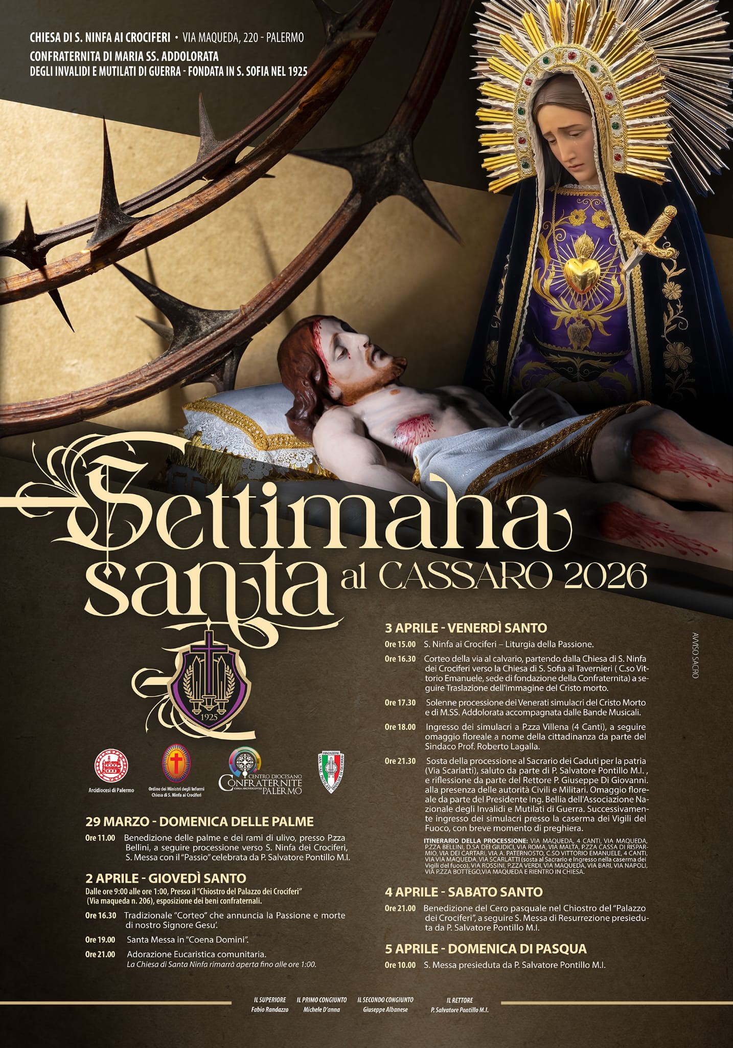 Anche quest’anno si rinnova da Palermo un forte e accorato appello per la pace nel mondo. L’iniziativa è promossa dai Padri Camilliani e dalla Venerabile Confraternita di Maria Santissima Addolorata degli Invalidi e Mutilati di Guerra, storica realtà fondata nel 1925.