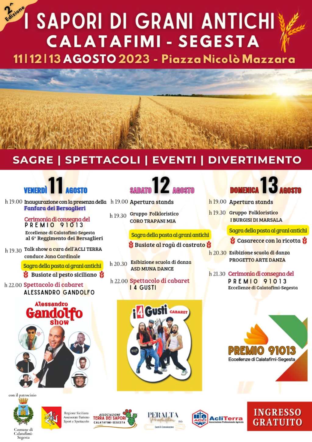 Dall’11 al 13 agosto si svolgerà a Calatafimi-Segesta la seconda edizione della fiera enogastronomica “I Sapori di Grani Antichi”. L’evento è organizzato dall’Associazione “Terra dei Sapori – Calatafimi Segesta” – presieduta da Diego Scandariato – con il supporto della Peralta Production, di Filippo Peralta, e con il patrocinio del Comune di Calatafimi-Segesta e dell’Assessorato Regionale al Turismo, Sport e Spettacolo. Il programma è ricco di sorprese, tra degustazioni e intrattenimento per grandi e piccoli, con gruppi folkloristici, scuole di ballo, musica e cabaret. Oltre alle degustazioni di vini pregiati e prodotti tipici della zona, la fiera prevede stand gastronomici e spettacoli musicali. La manifestazione, che si svolgerà in piazza Nicolò Mazzara, ha l’obiettivo di far incontrare il pubblico con i produttori locali e i loro prodotti a Km 0. La kermesse quest’anno punta i riflettori sulla “Sagra della Pasta di Grani Antichi Siciliani”, con piatti prelibati cucinati dagli chef del territorio, che saranno disponibili ogni sera negli stand allestiti in piazza. In programma anche la 1^ edizione del Premio 91013 – Eccellenze di Calatafimi-Segesta. Venerdì 11 agosto si terrà la cerimonia di consegna del Premio al 6° Reggimento dei Bersaglieri, mentre domenica 13 agosto il Premio verrà assegnato a chi, nei vari ambiti, si è distinto per meriti, tra i cittadini del territorio. “Una bella novità – dice Filippo Peralta, ideatore del Premio che da anni tocca le varie città della provincia – e siamo contenti di organizzare la nostra kermesse anche a Calatafimi-Segesta. Una manifestazione ormai radicata nel territorio, che riceve consenso e affetto da parte di Amministrazioni e cittadini”. Ogni sera l’evento prenderà il via alle ore 19. L’ingresso è gratuito.