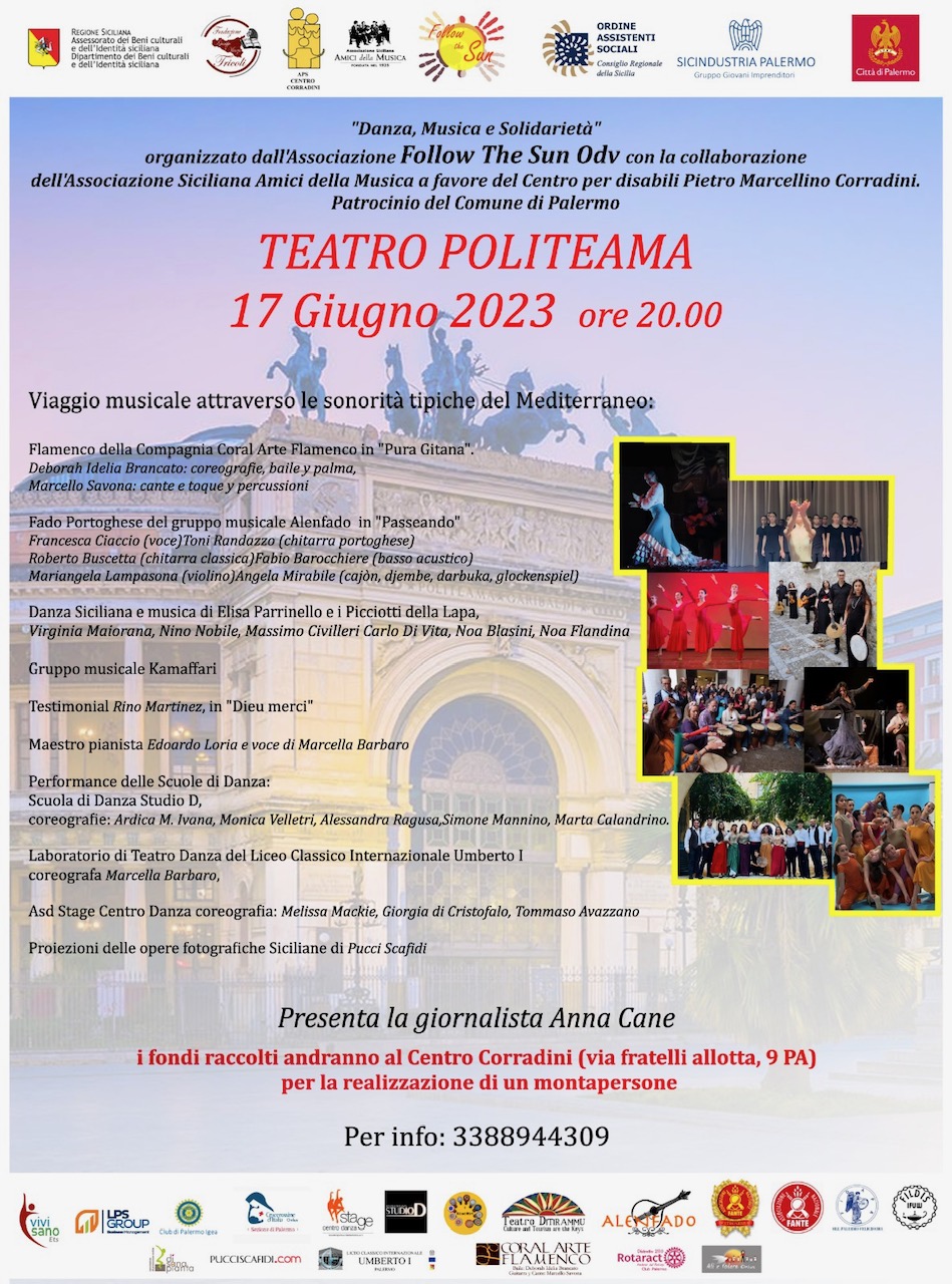 Sabato 17 giugno alle ore 20 al Teatro Politeama di Palermo si terrà lo spettacolo di beneficenza, organizzato dall’associazione Follow the Sun Odv, presieduta da Luciana Ardizzone, con la collaborazione degli Amici della Musica. L’associazione invita la città allo spettacolo di solidarietà, patrocinato dal Comune di Palermo, che sosterrà il progetto a favore del Centro per disabili Pietro Marcellino Corradini, per la realizzazione di un montapersone che renderà totalmente accessibile la struttura.